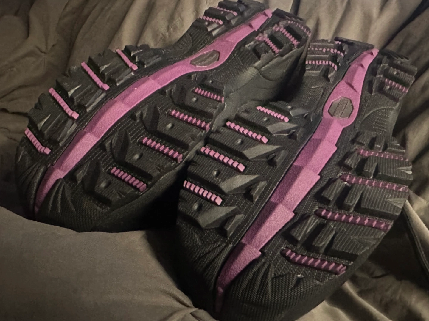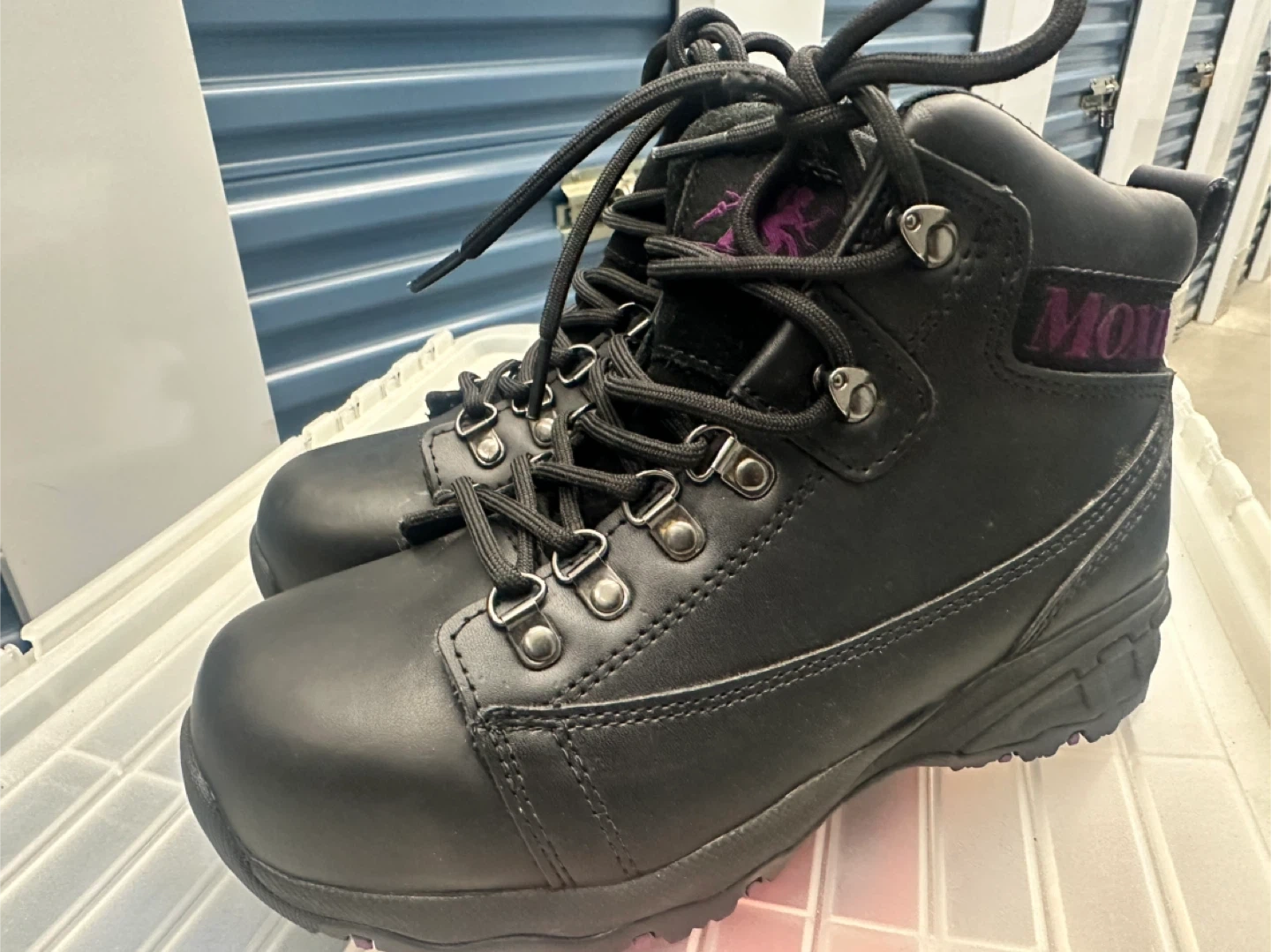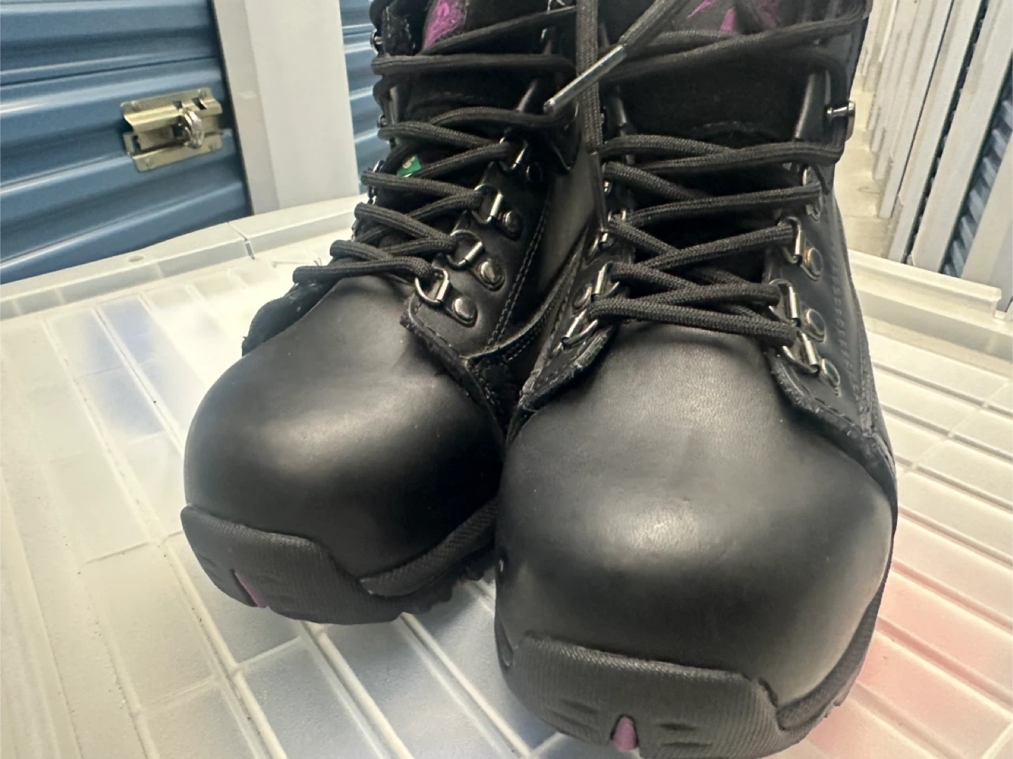 Pair of steel toe black leather work boots. Lace-up style. Purple accents. Durable soles. Good for work or outdoor activities.