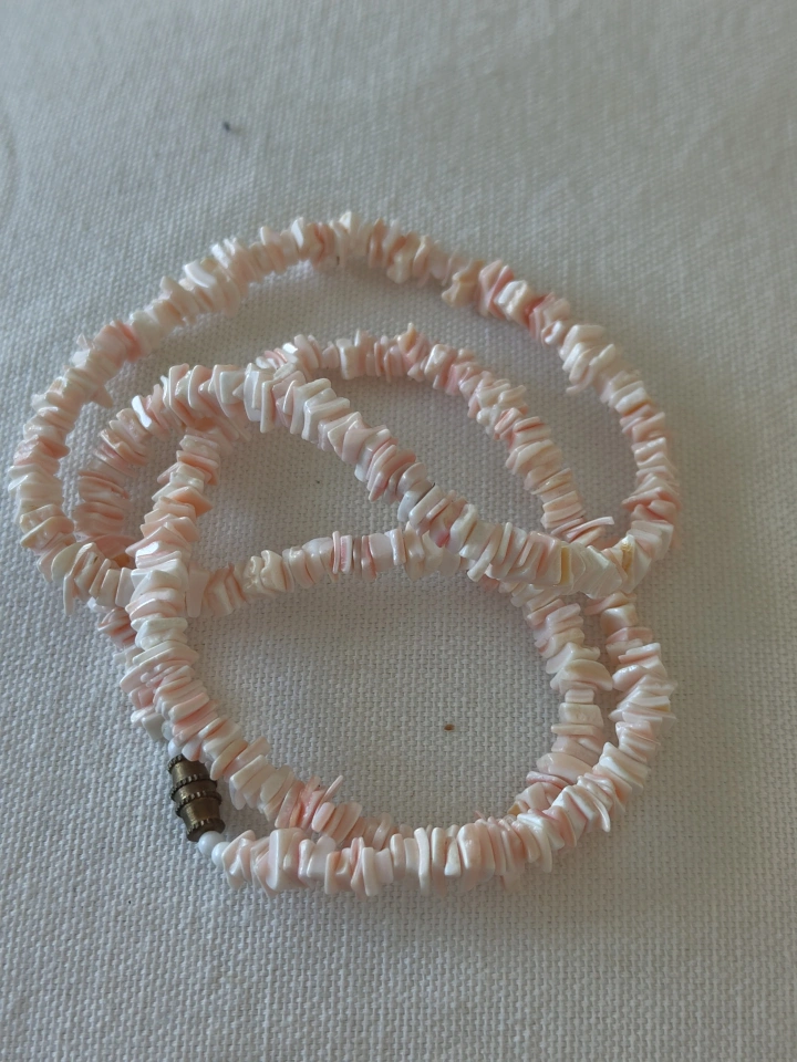 Simulated pink shell necklace. Features small, square-shaped plastic shell pieces. Clasp present. Lightweight and pretty.