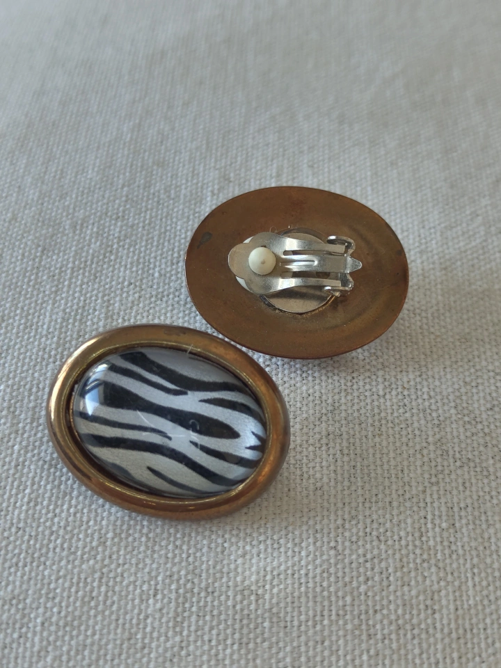 Pair of clip-on earrings. Oval shaped gold-tone metal setting. Zebra print design. Unique and stylish.