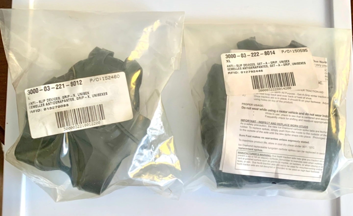 Unisex. Two pairs of Grip-X™ anti-slip ice grippers. New, in original packaging. Designed for added traction on ice and snow. Easy to use and install.