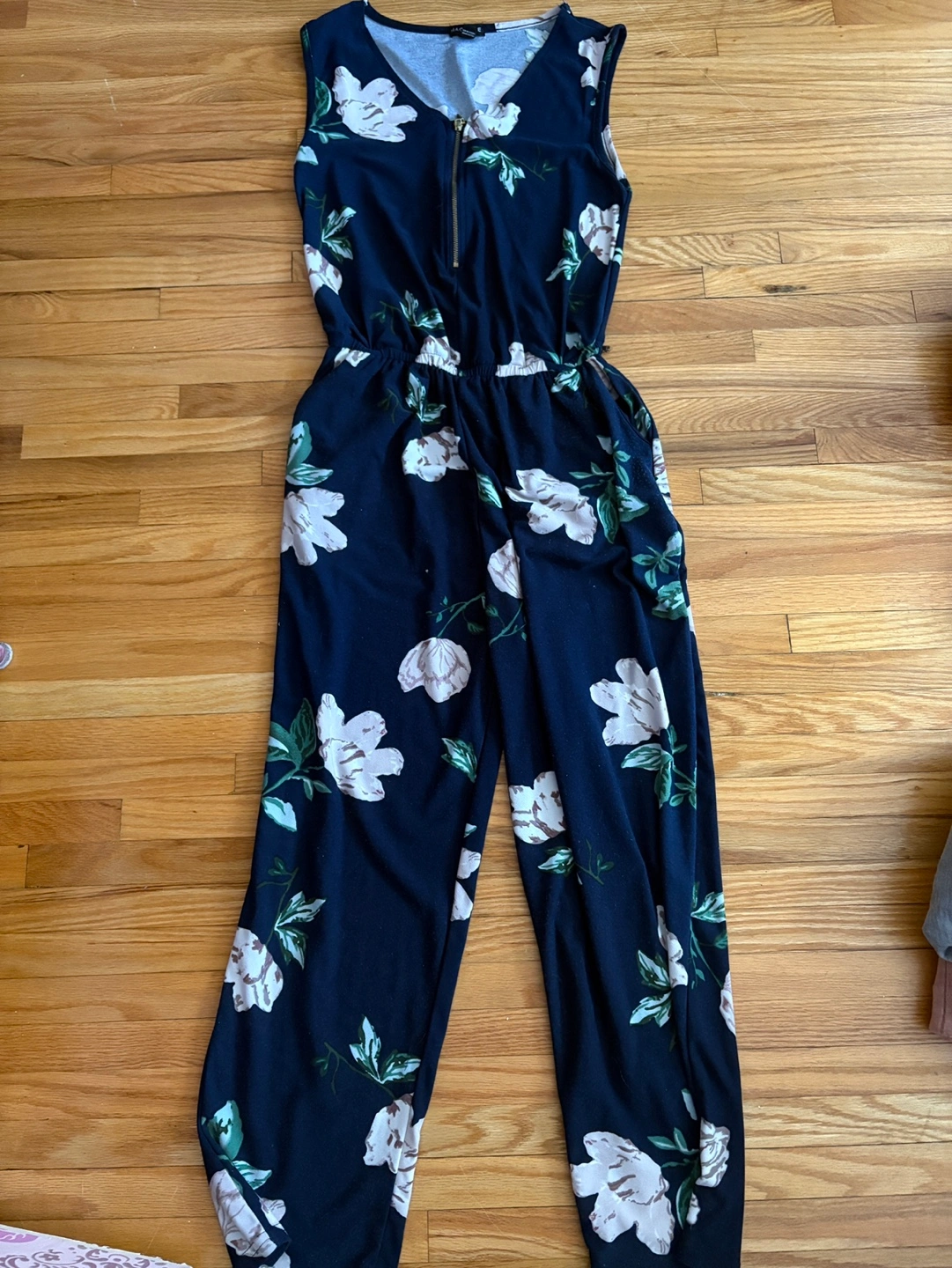 Sleeveless jumpsuit. Features a v-neck and zip closure. Elastic waistband. Floral pattern. Side pockets.