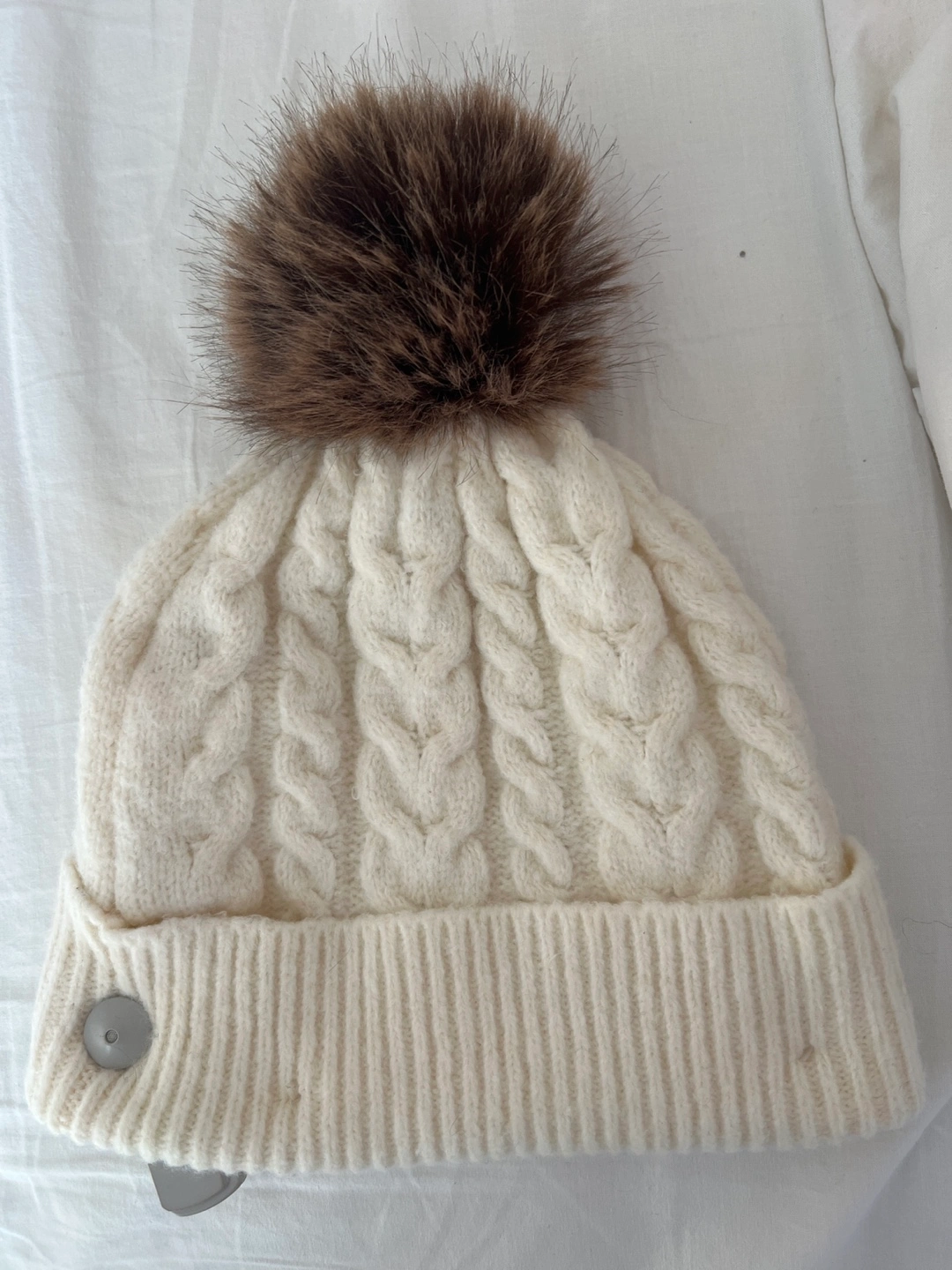 181Warm cable knit beanie. Features a brown faux fur pom pom. Off-white colour. Knitted fabric.