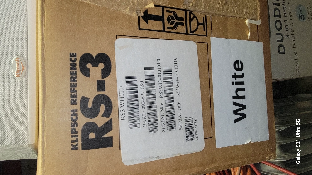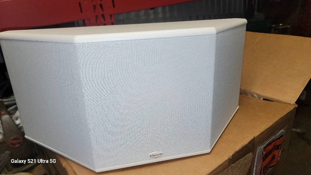New in box Klipsch Reference RS-3 surround sound speaker. White finish. Two-way system. 6.5" Aluminum Woofer Cone. Designed and engineered in Hope, Arkansas, U.S.A.