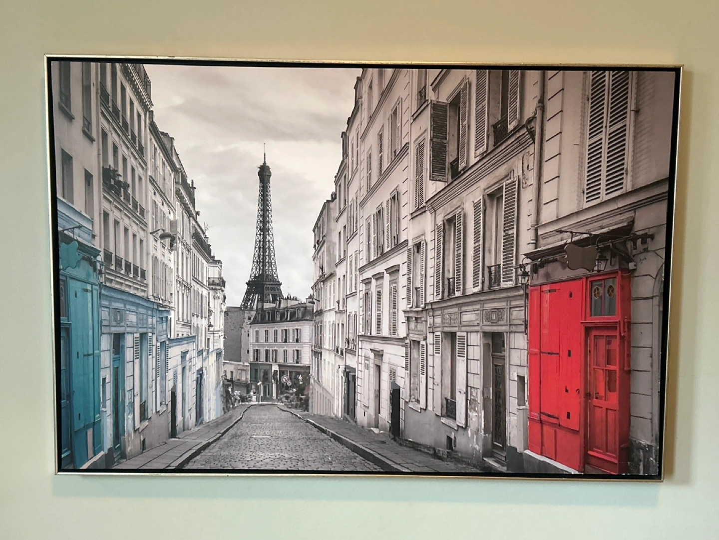 Large canvas print. Features a Parisian street scene in black and white, Eiffel Tower visible in the distance. One red door stands out.