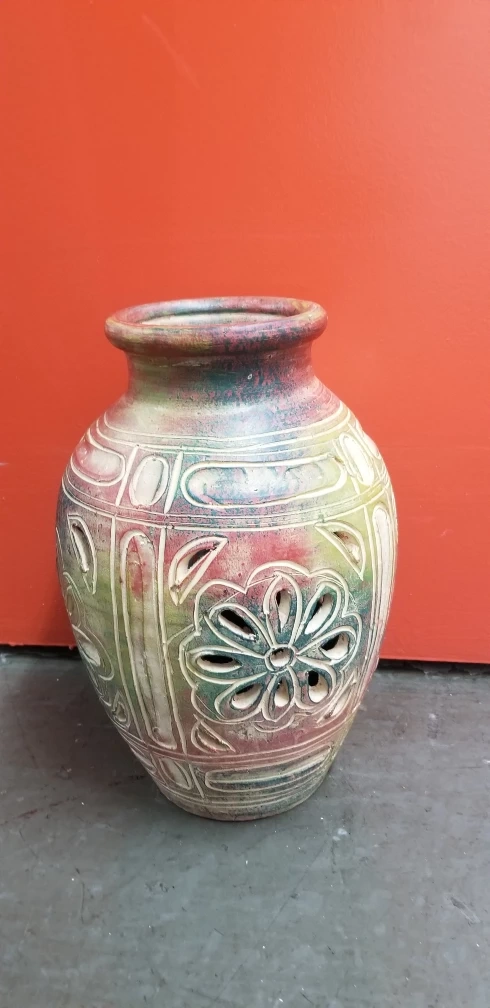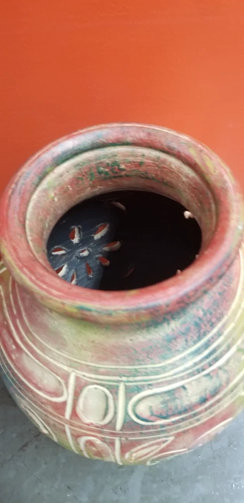 Terracotta pot. Intricate carvings and hand-painted design. Multicoloured glaze. Perfect for plants or décor.