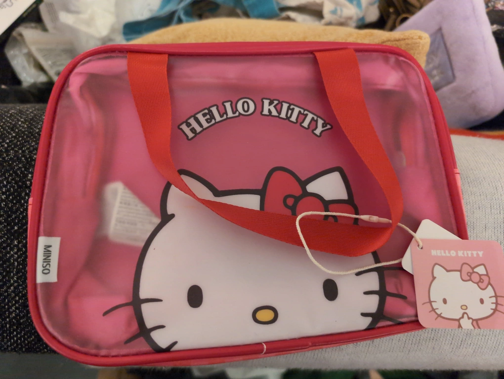 Red Hello Kitty bag. Features a transparent front and red carrying handles. Perfect for travel, everyday use or organizing toiletries. can be used as either a hand or cosmetic bag