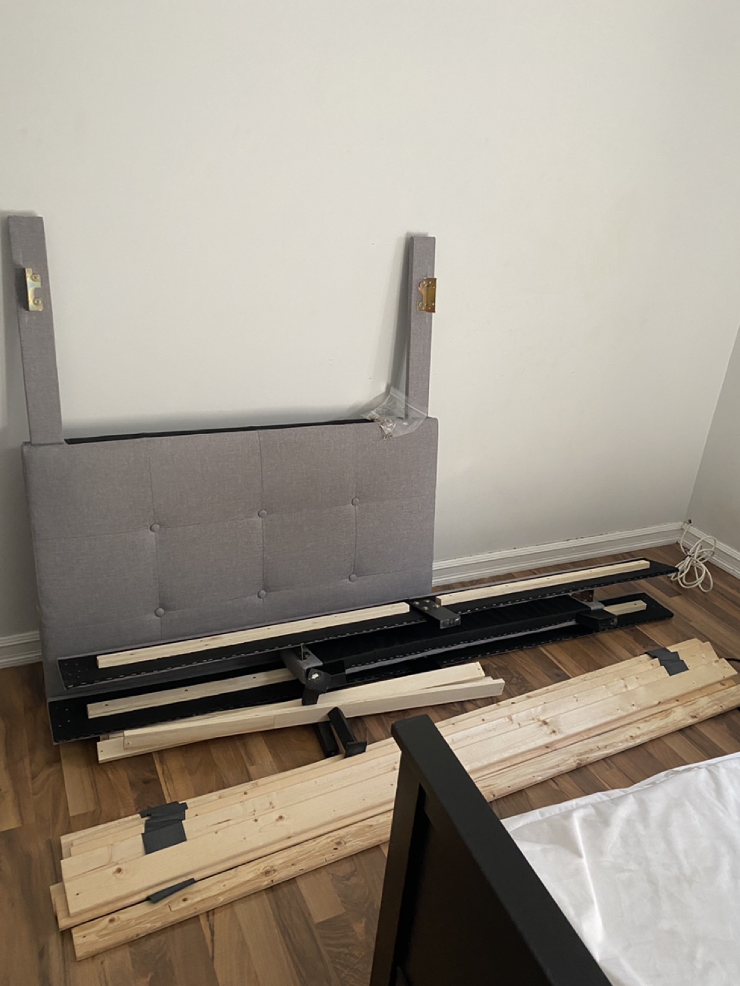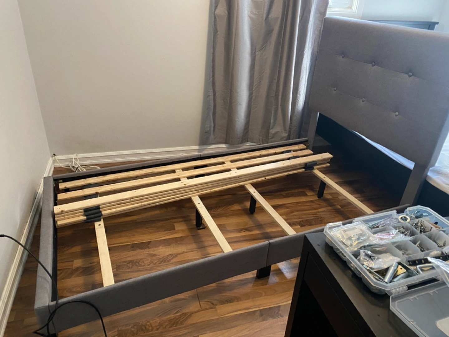 Disassembled twin-size bed frame, ready to go to a new home. Grey fabric headboard and footboard. Wooden slats included with hardware.