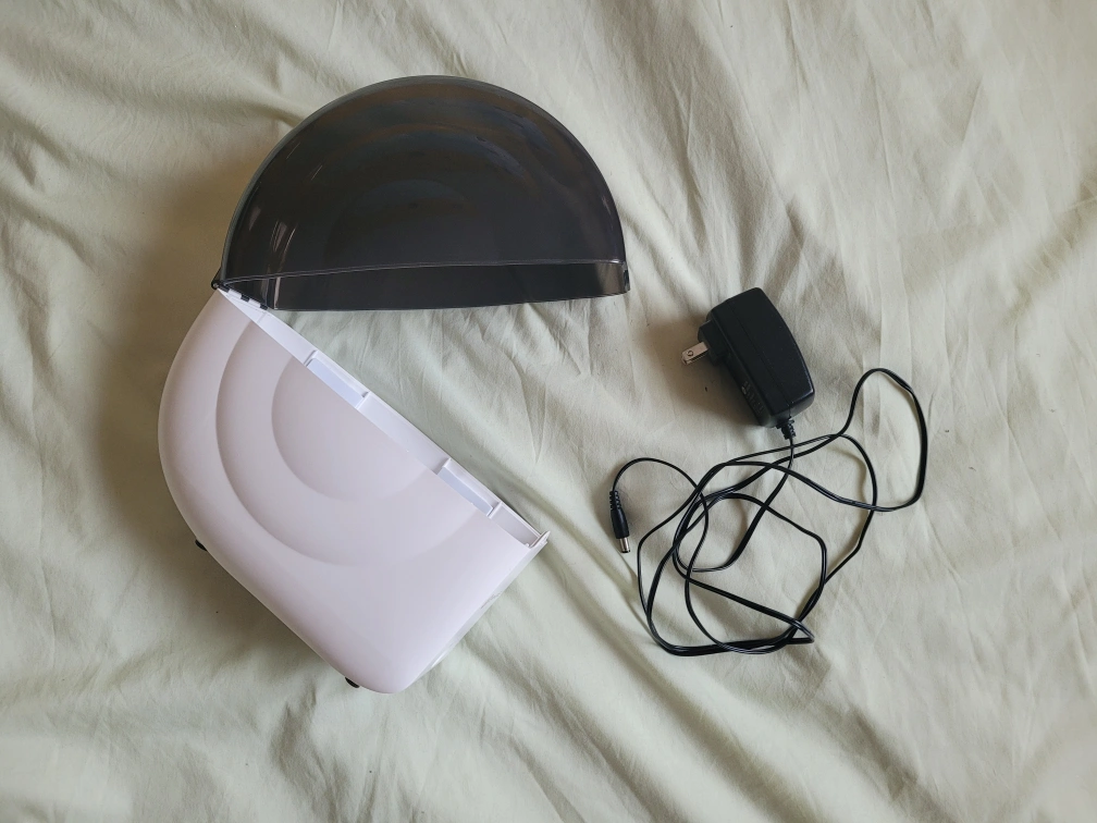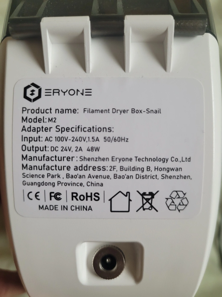 Filament Dryer Box-Snail model M2. Includes power adapter. Electric dryer for 3D printer filament. Grey and white plastic housing.