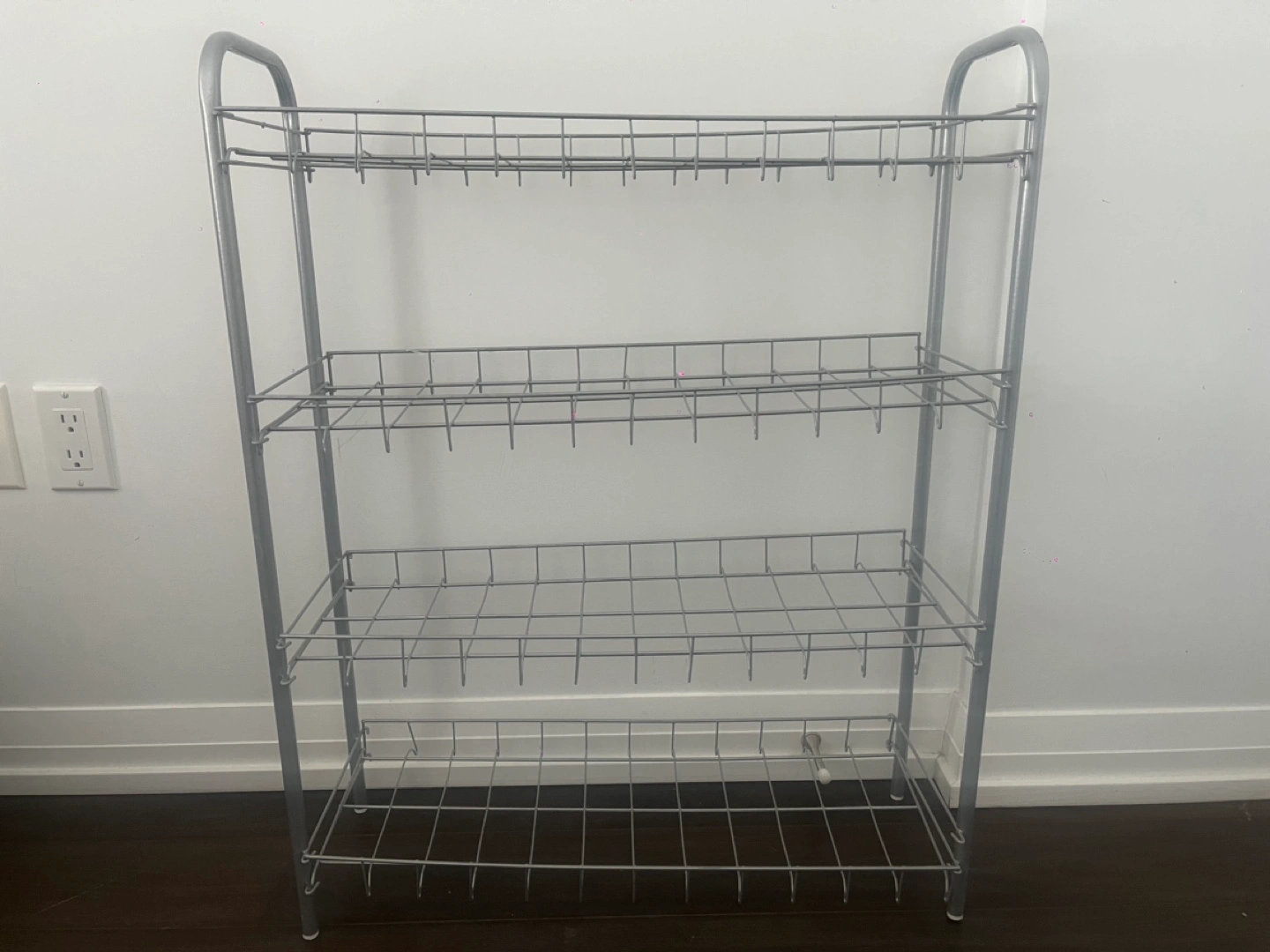 Silver metal storage rack. Four shelves. Great for organizing shoes, pantry items, or other household goods.