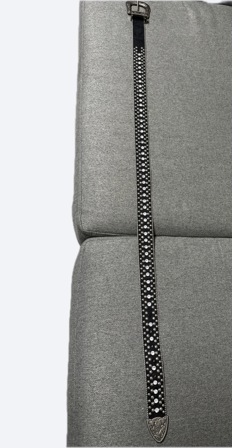 Black leather belt. Rhinestone embellishments. Silver toned buckle. Size medium. Man-made material. Excellent condition.