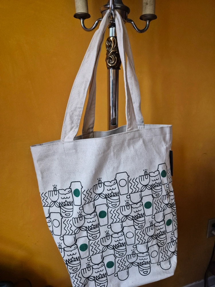 Large beige canvas tote bag. Features a repeating pattern of Starbucks cups and designs. Great for shopping or everyday use.