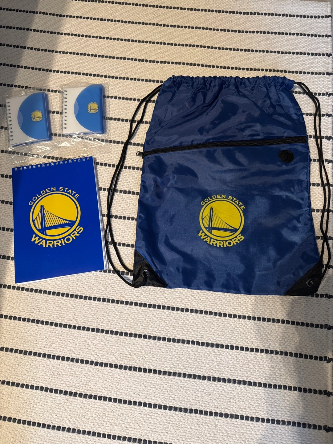 Golden State Warriors drawstring backpack. Includes two small notebooks and a larger notepad. Perfect for game, school, or travel.