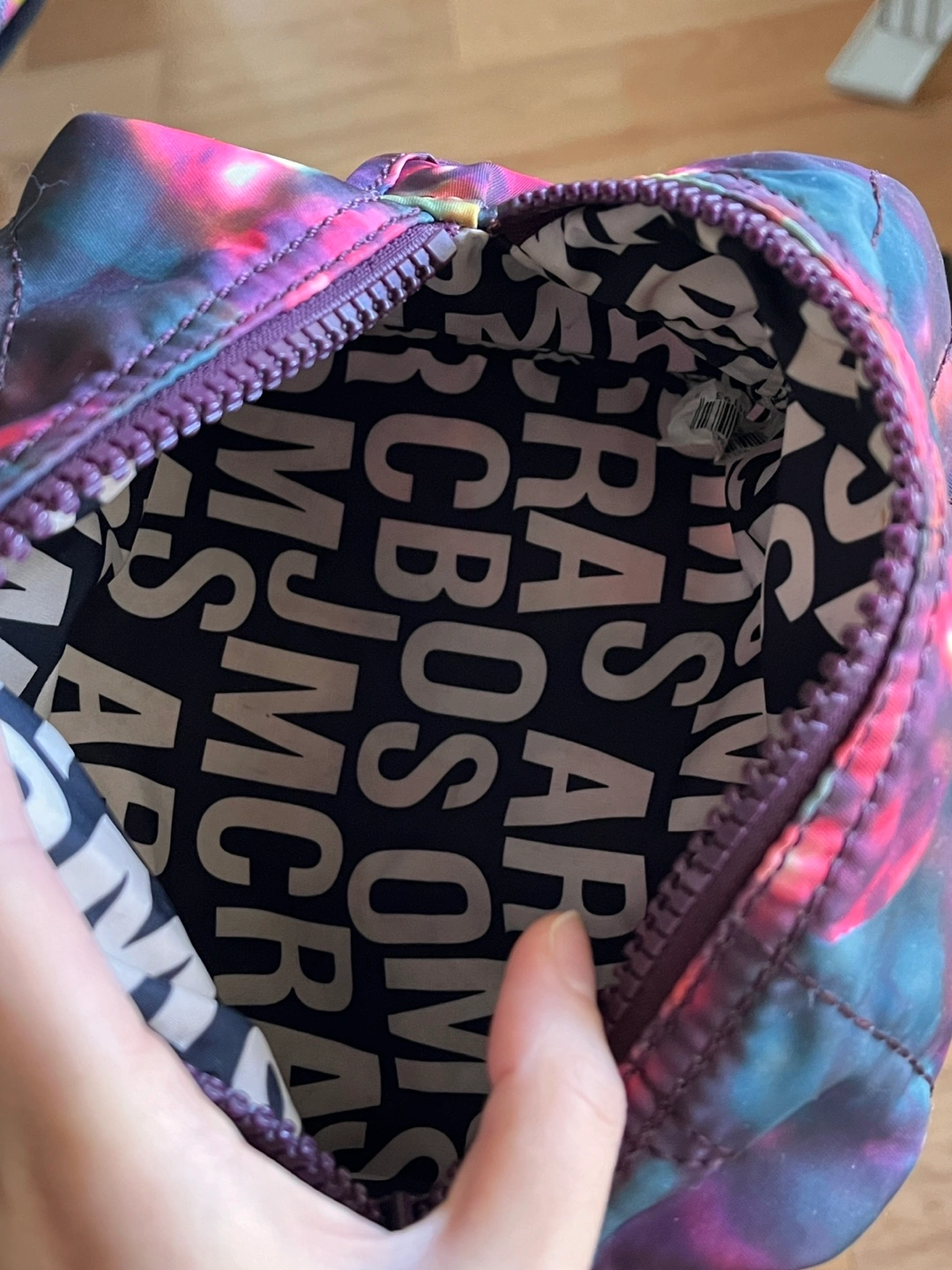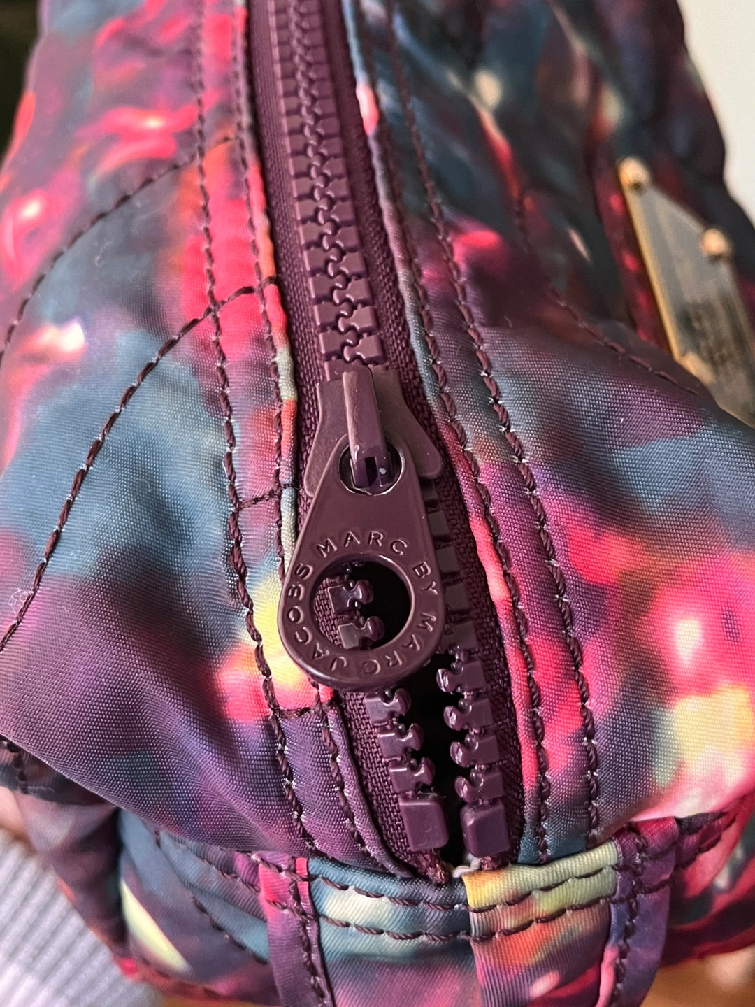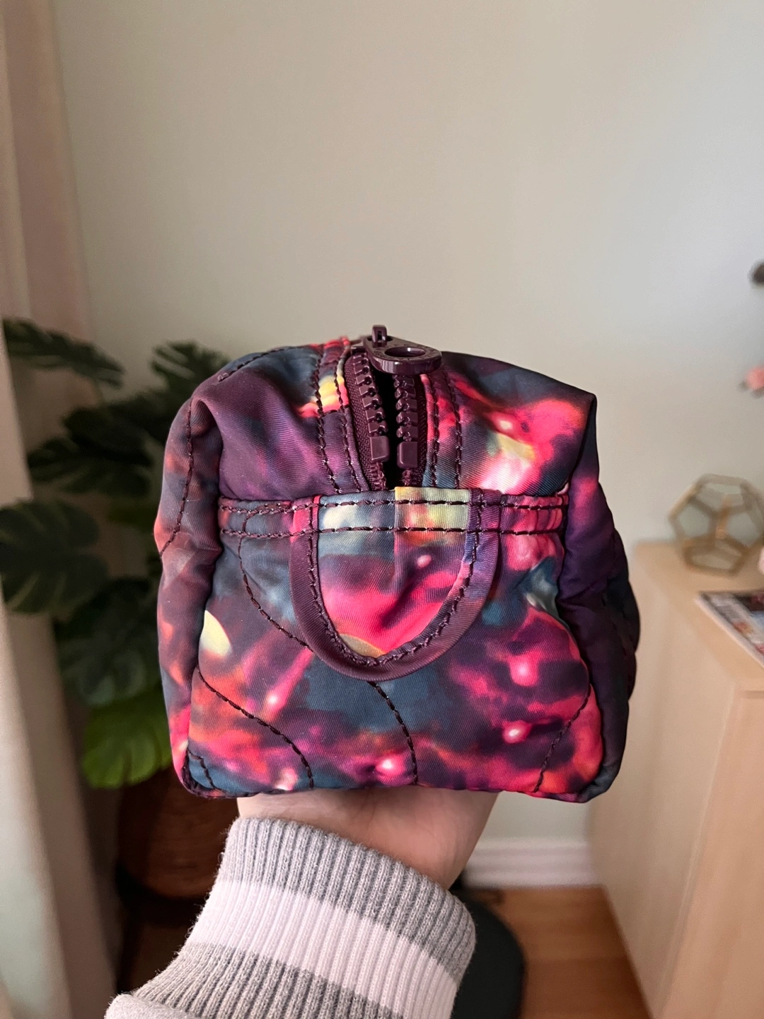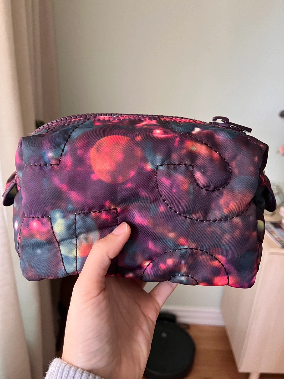 Purple quilted large cosmetic bag. Features a zipper closure and colourful print. Excellent for travel or everyday use.