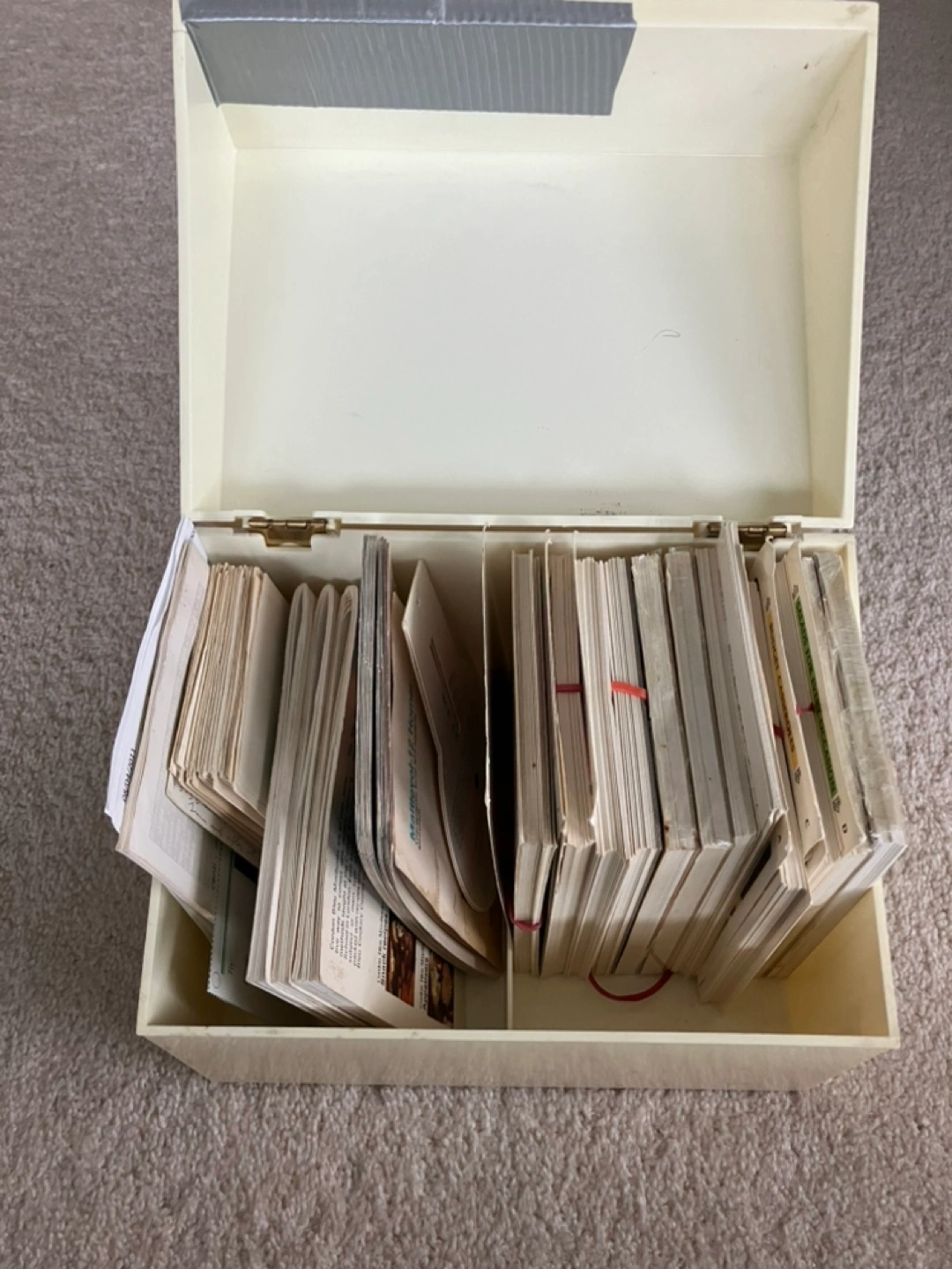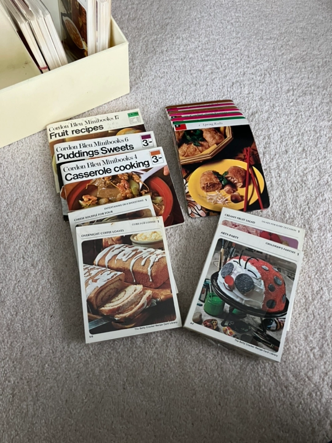 Collection of vintage recipe cards and booklets. Variety of largely incomplete sets. Some brand new, still in plastic packaging, others in used condition. Storage box works but in poor condition.