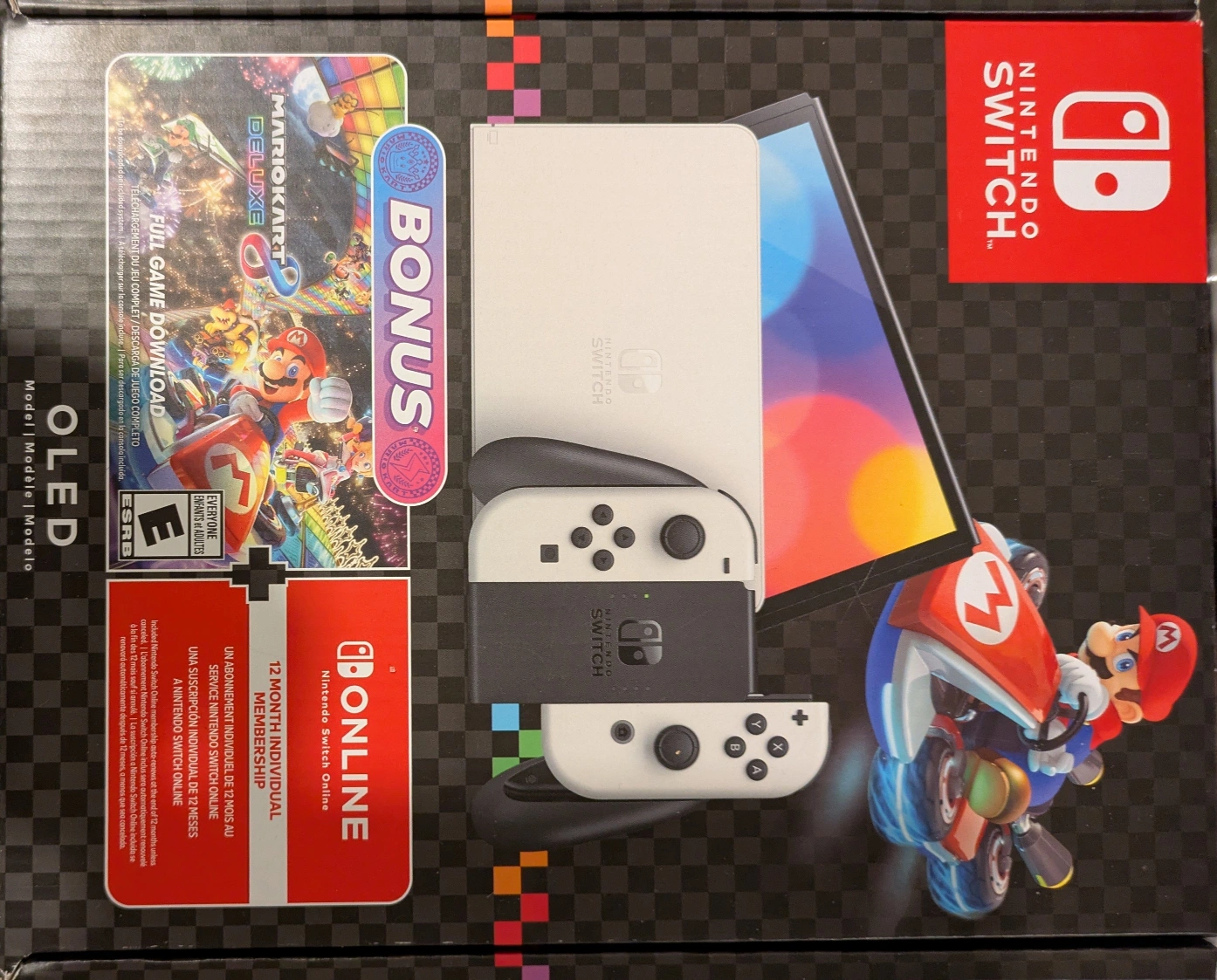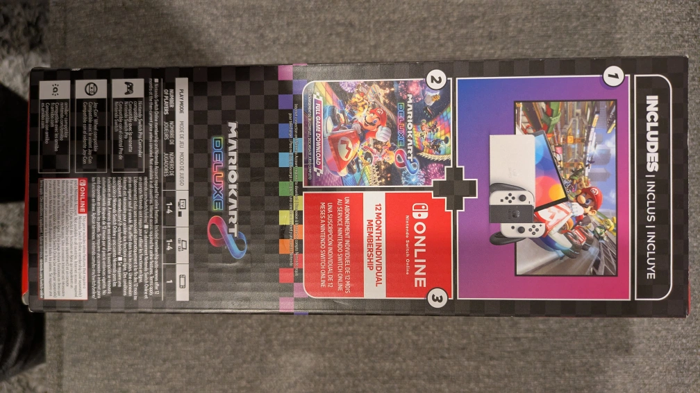 New Nintendo Switch OLED model. Includes Mario Kart 8 Deluxe full game download and 12-month Nintendo Switch Online individual membership. White Joy-Cons. Sealed pack