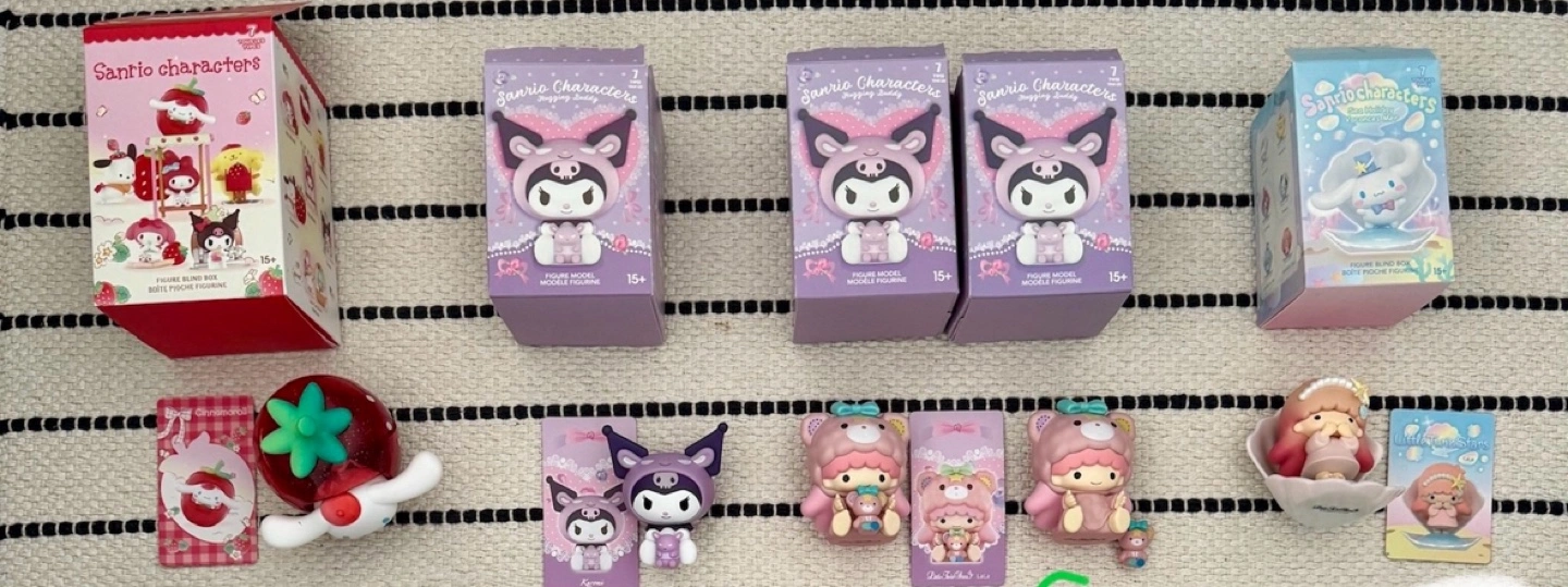 Collection of 5 Sanrio character figurines ( blind box collectibles). Includes Kuromi, Cinnamoroll, and Kiki & Lala. Includes original boxes and cards.