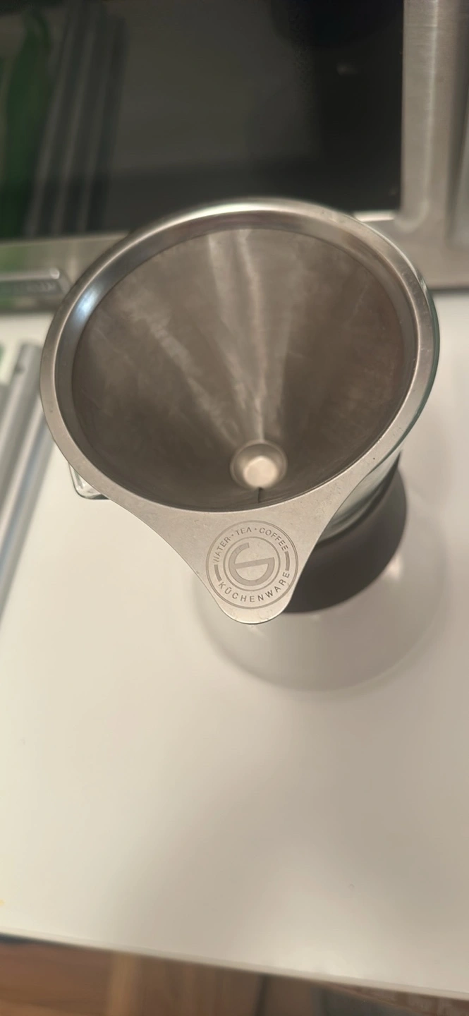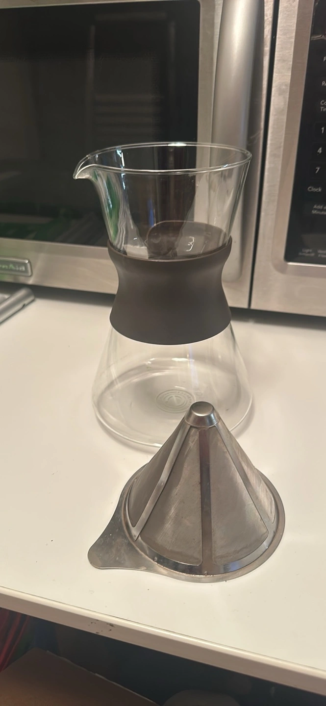 Stainless steel pour over dripper and glass server. Used, but in good condition. Great for pour over coffee brewing. Includes both the filter and carafe.
