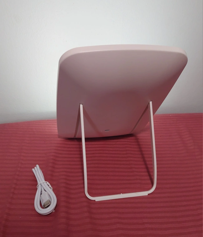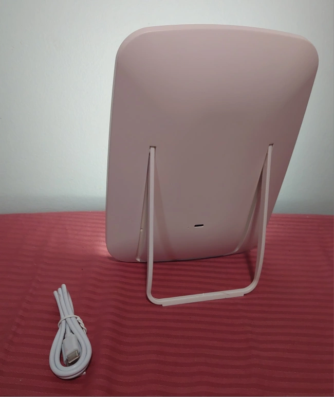 Portable vanity mirror. Features adjustable LED lighting. USB rechargeable and comes with charger. Excellent for travel or home vanity use!