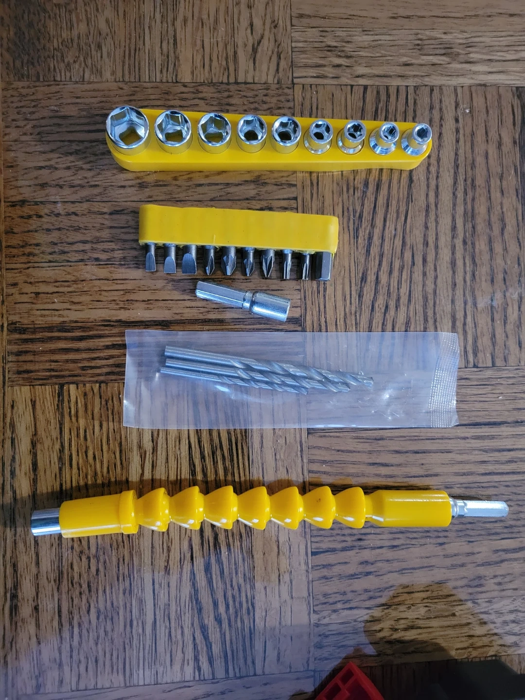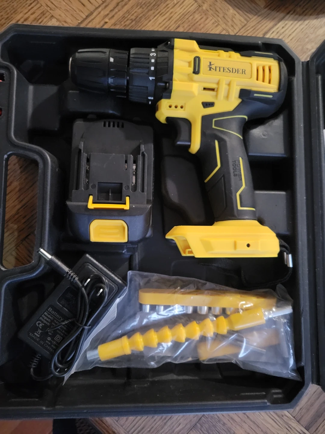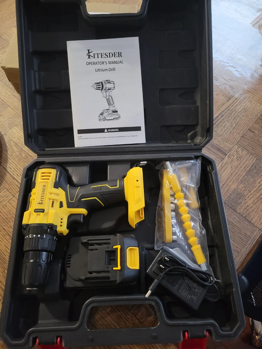 This is a Kitesder DZ20V-C05 cordless lithium drill kit. It includes the drill, a battery, a charger, and various drill bits and accessories. Pick up in Ridgewood, NY