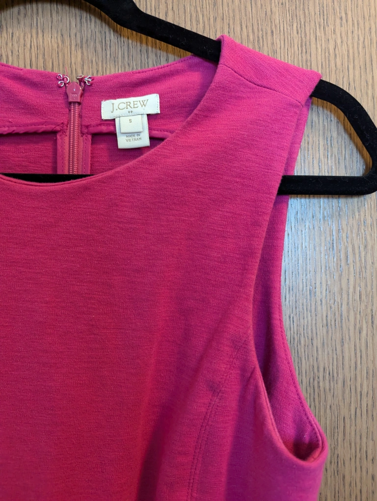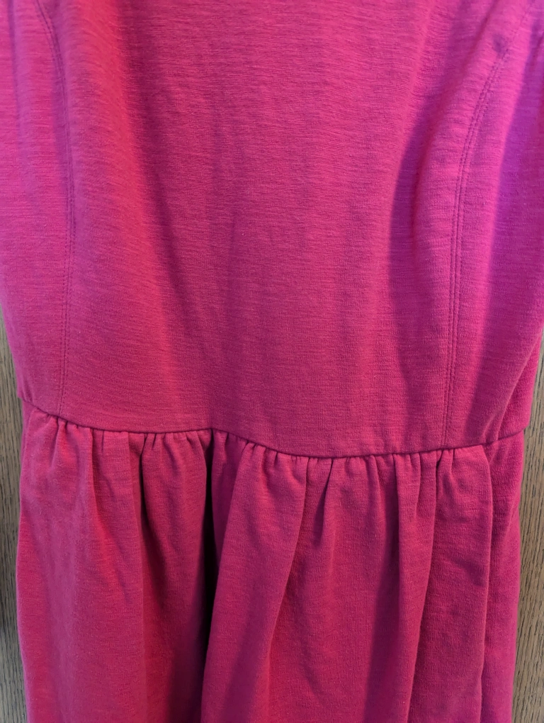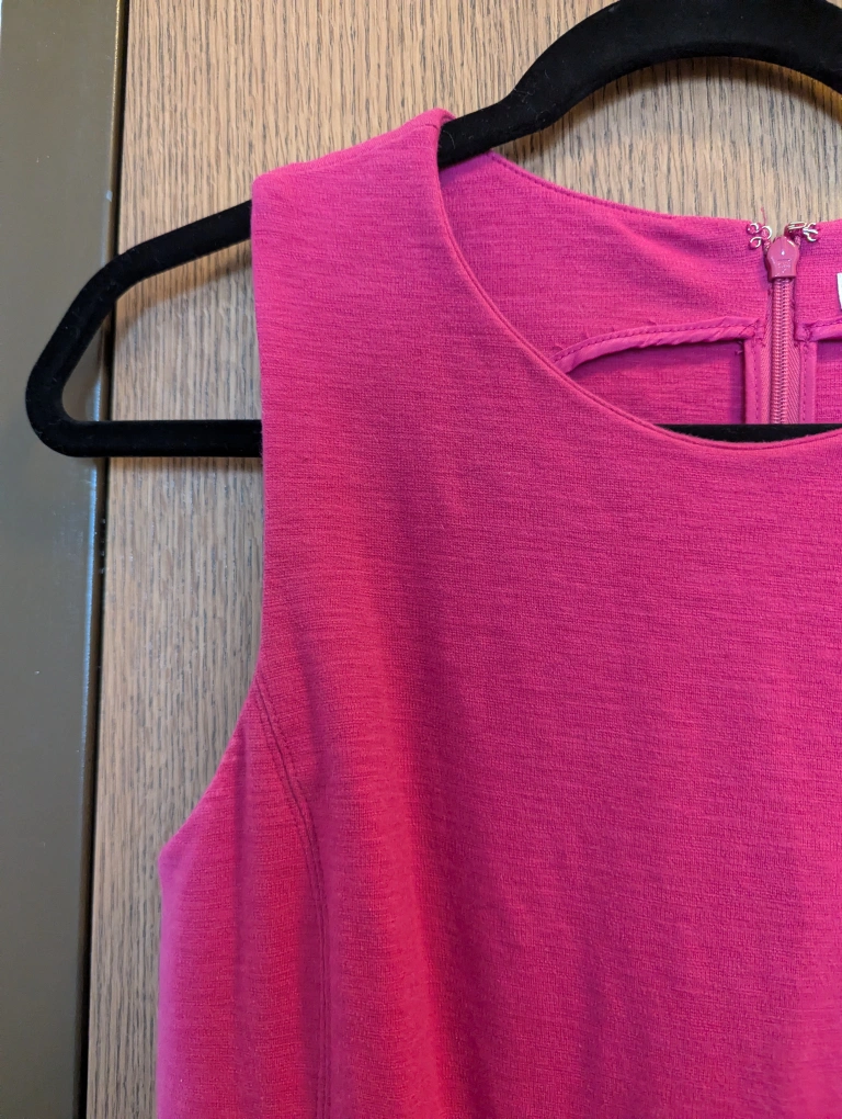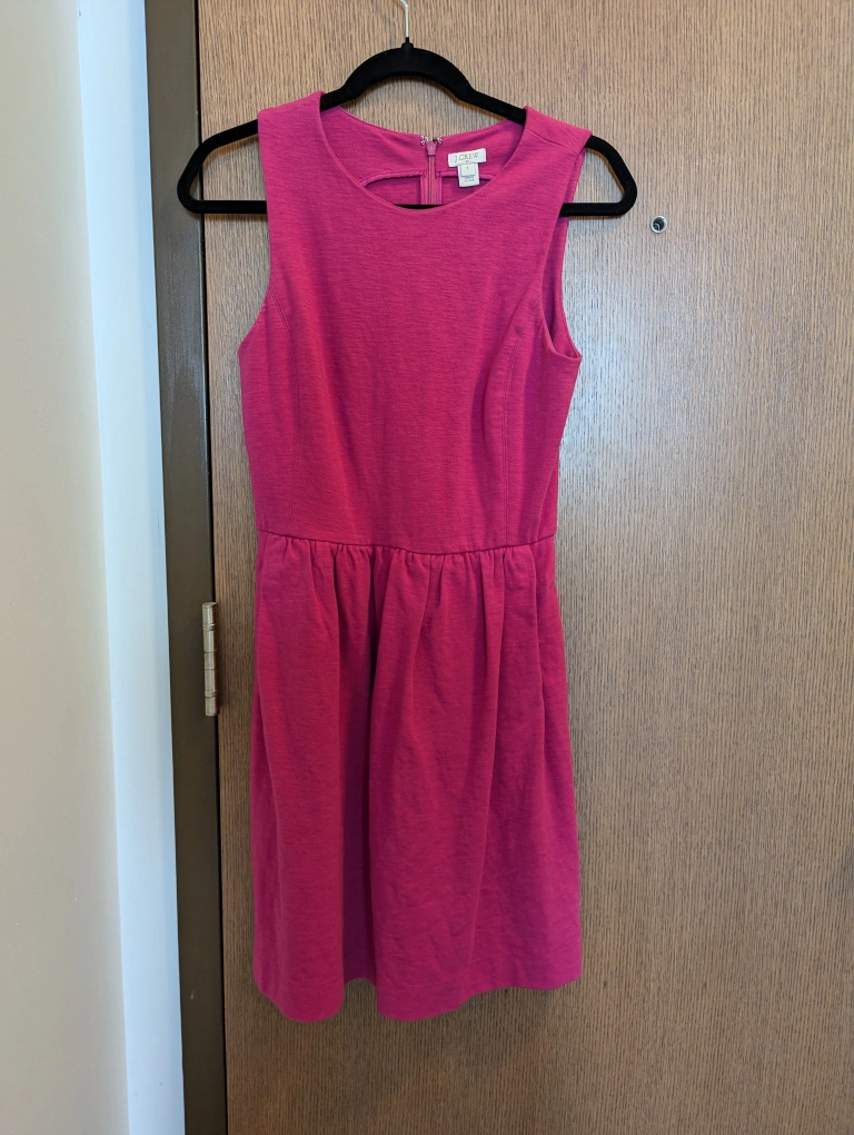 Sleeveless, pink, A-line dress. Features a zipper in the back and is made of a slightly textured material. The dress is sized small.