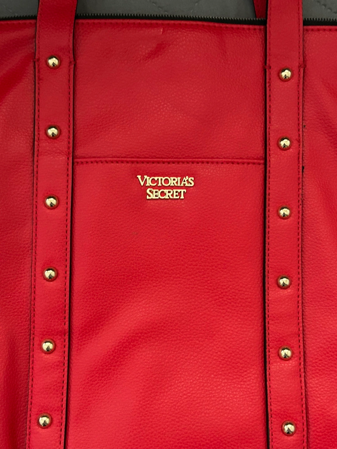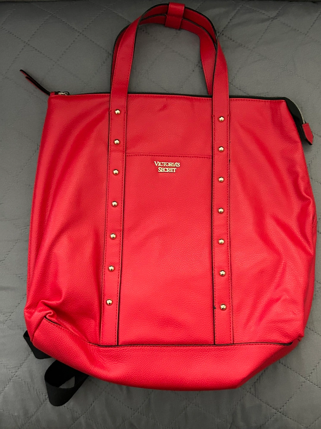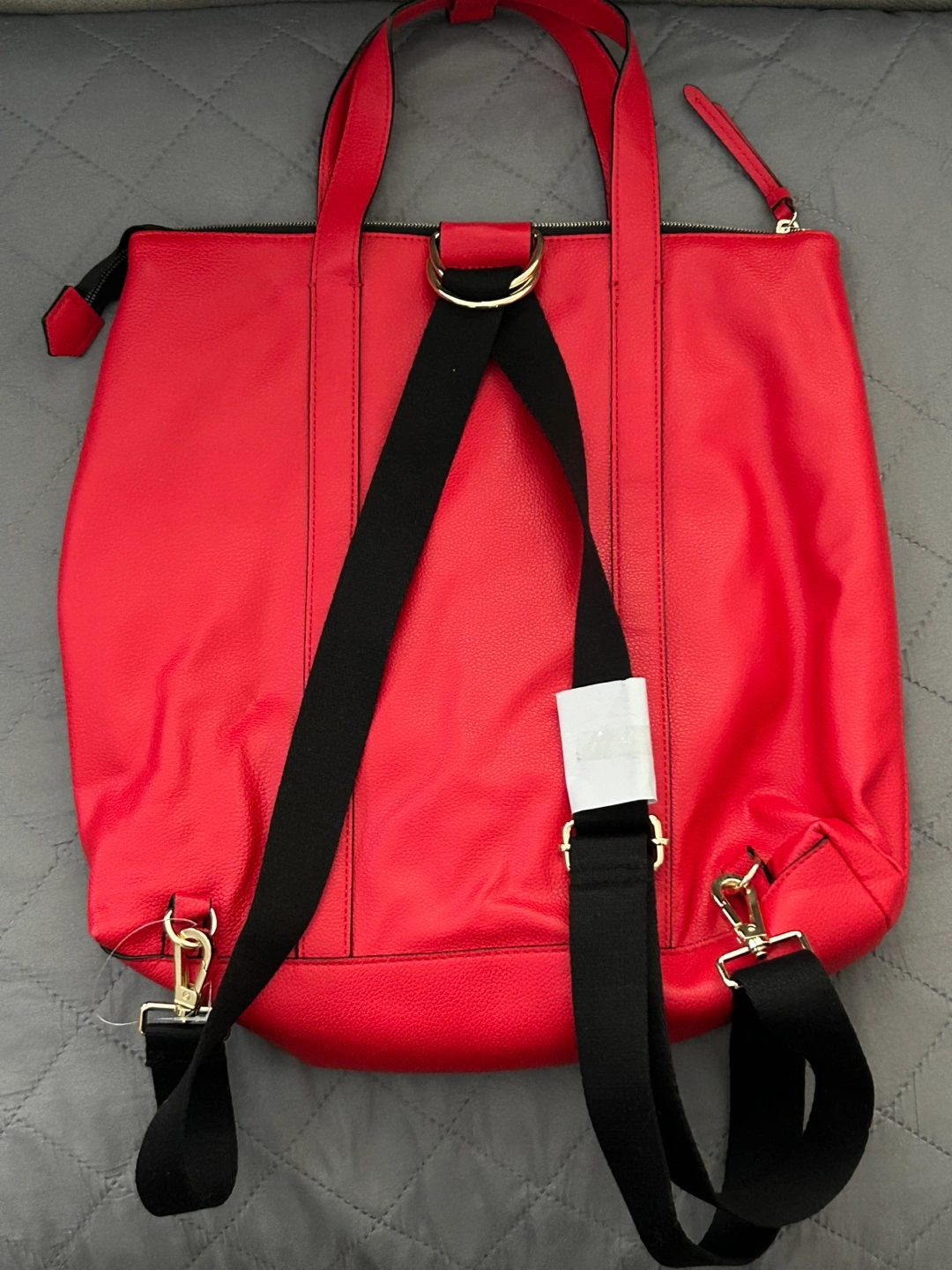 Convertible backpack tote. Red leather-like material. Gold-toned studs. Top handles and adjustable backpack straps. Zipper closure. Small interior pocket.