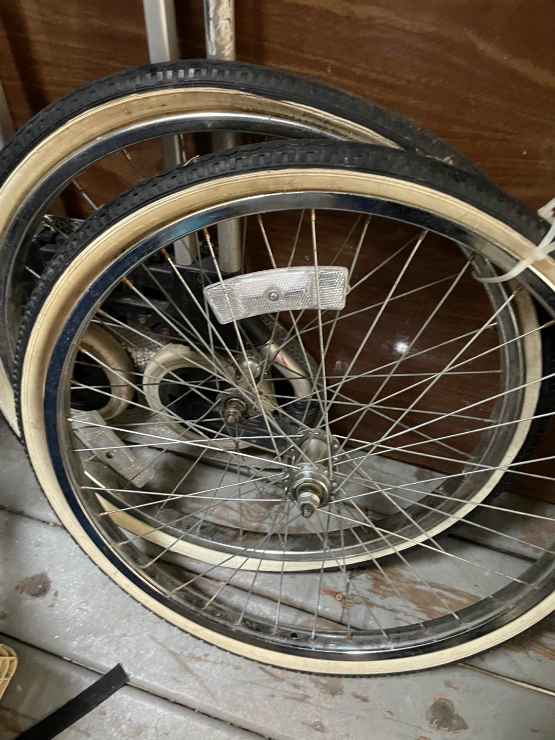 Two vintage bicycle wheels. Cream-colored tires. Metal rims. Spoke design. Reflectors attached. Good condition. Sold as is.