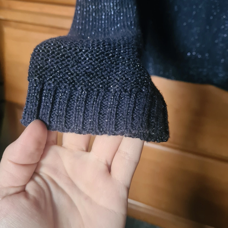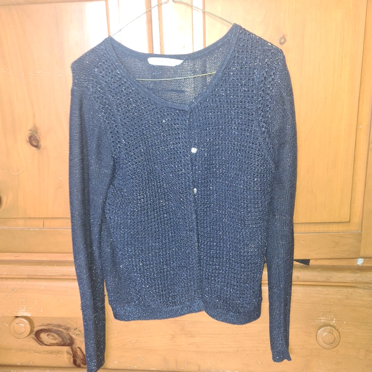 Dark navy blue sparkly cardigan. Size medium. Button closure. Long sleeves. Knit fabric. Good condition.
