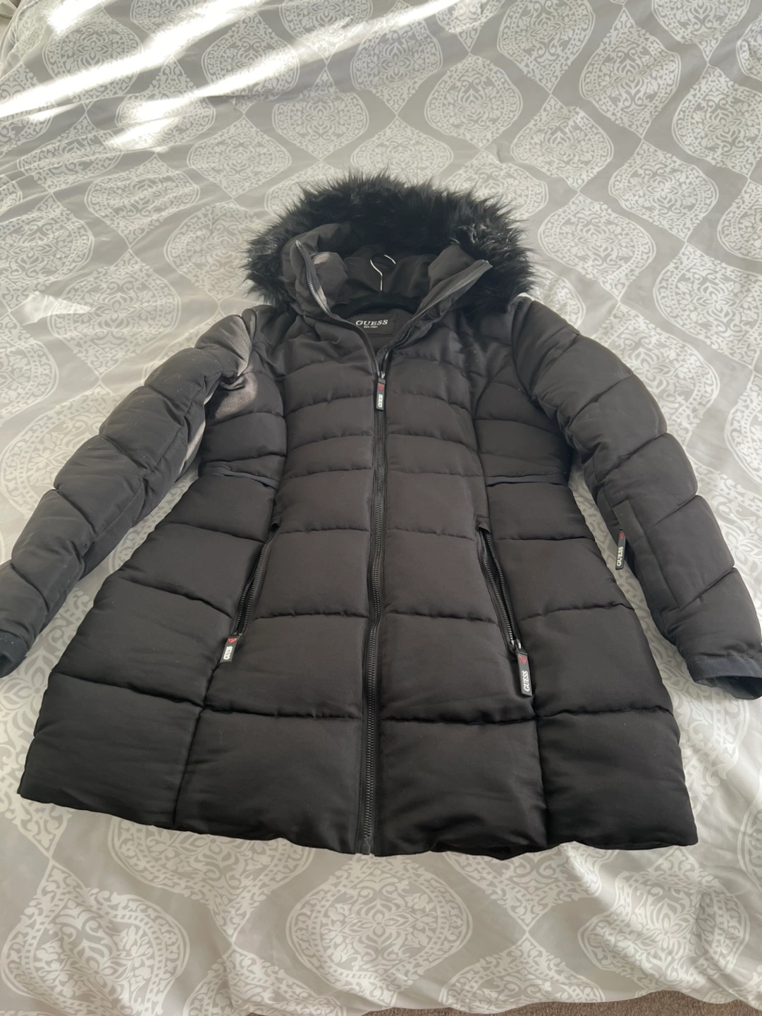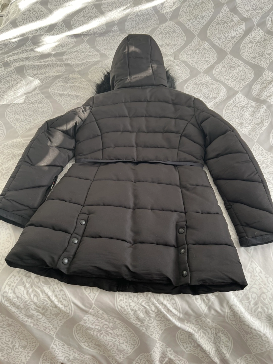 black puffer jacket. Features a faux fur trimmed hood, zip closure, and multiple pockets. Excellent for winter. Size m great for Valentine's gift
