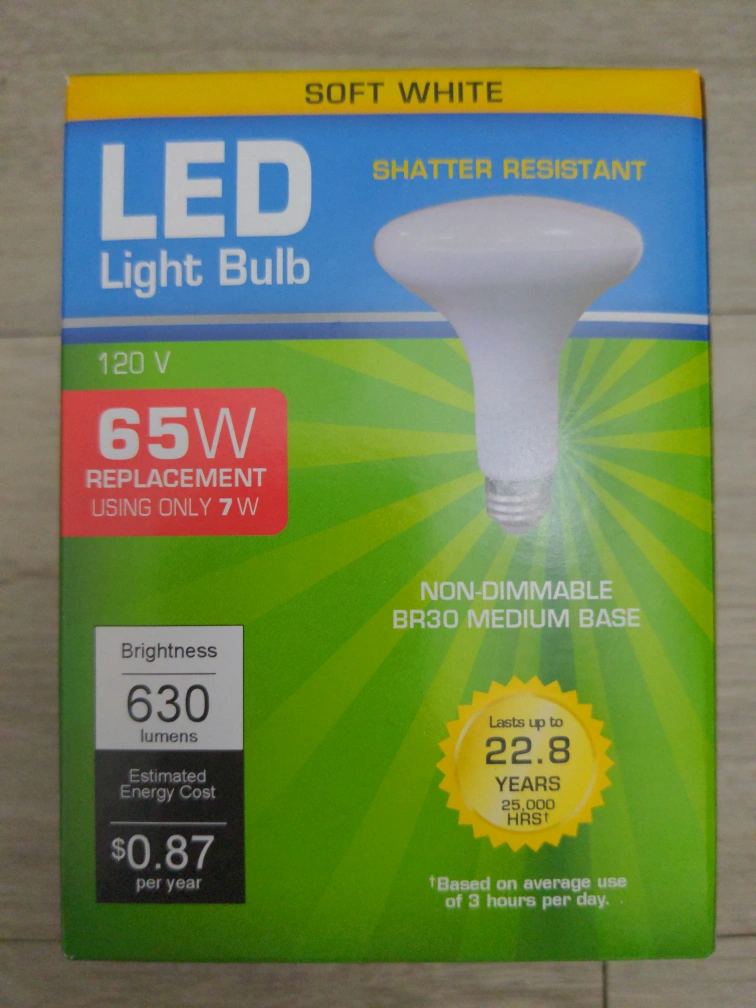 Soft white LED light bulb. 65W replacement using only 7W. 630 lumens. Non-dimmable. BR30 medium base. Shatter resistant. Lasts up to 22.8 years. Estimated energy cost $0.87 per year.