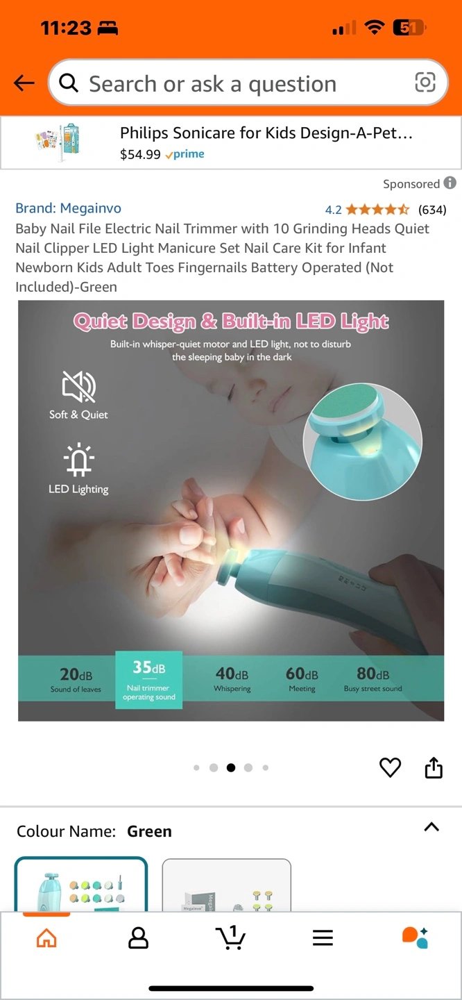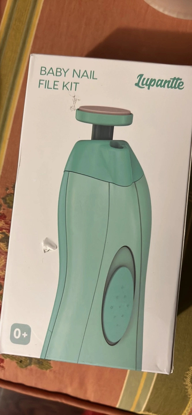 Baby nail file electric trimmer. Ten grinding heads. LED light. Quiet operation. For infant, newborn, kids, and adults. Battery operated (batteries not included).