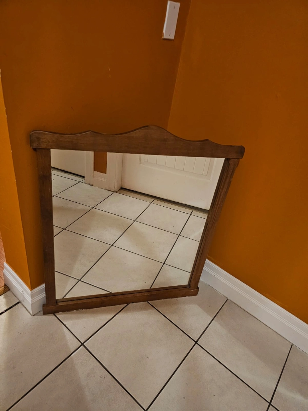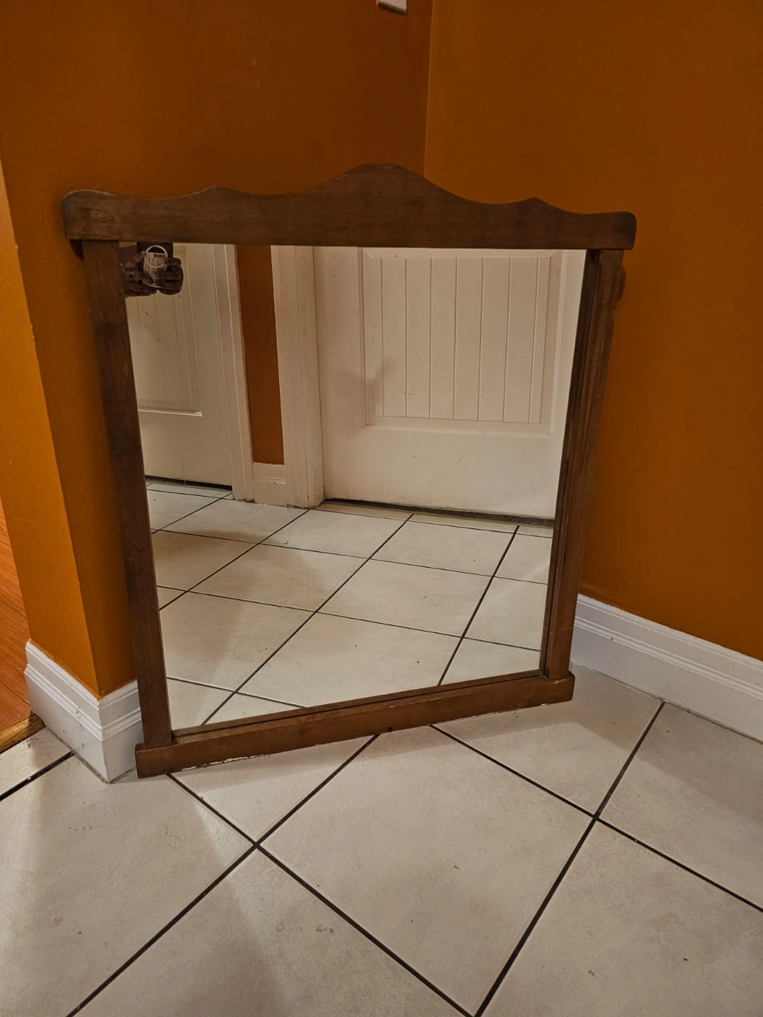 Dark brown wooden frame. Slight wear. Good condition. Perfect for a bathroom or bedroom. Adds character to any room.