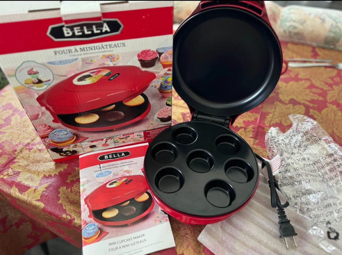 Red mini cupcake maker. Makes six mini cupcakes. Includes instruction manual and recipe guide. New in box.
