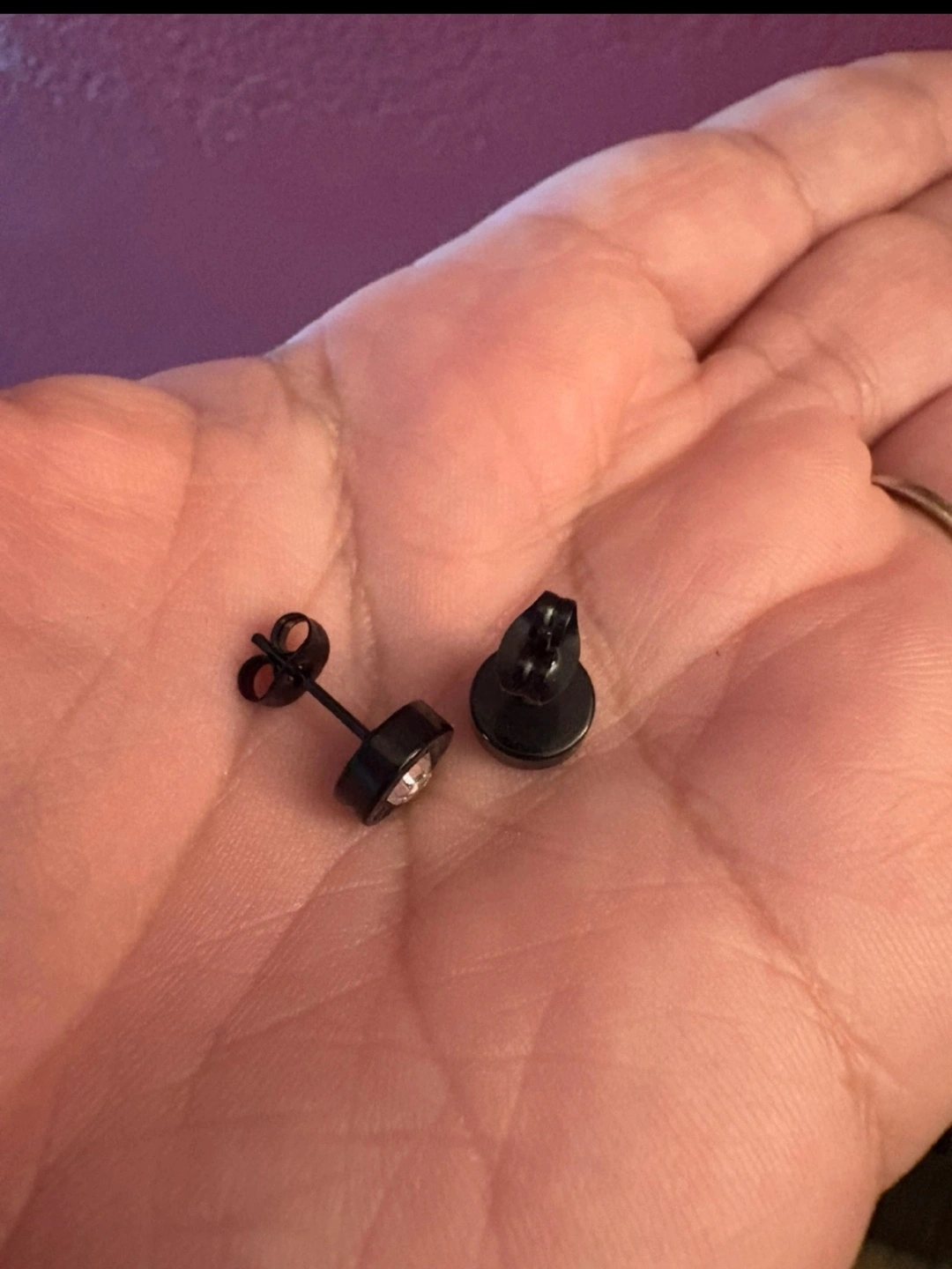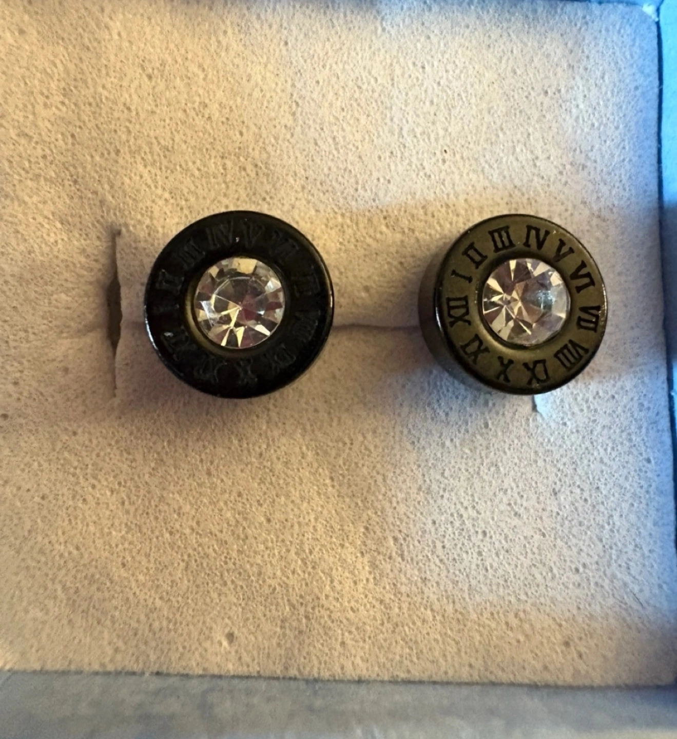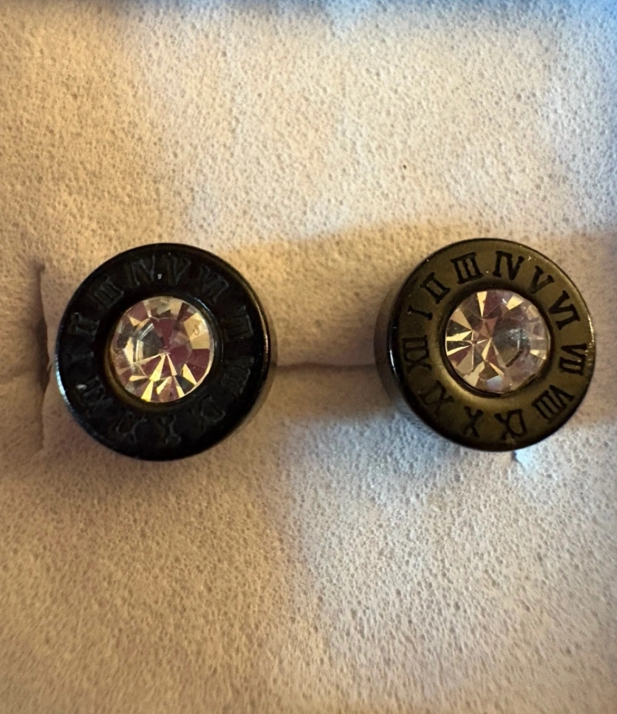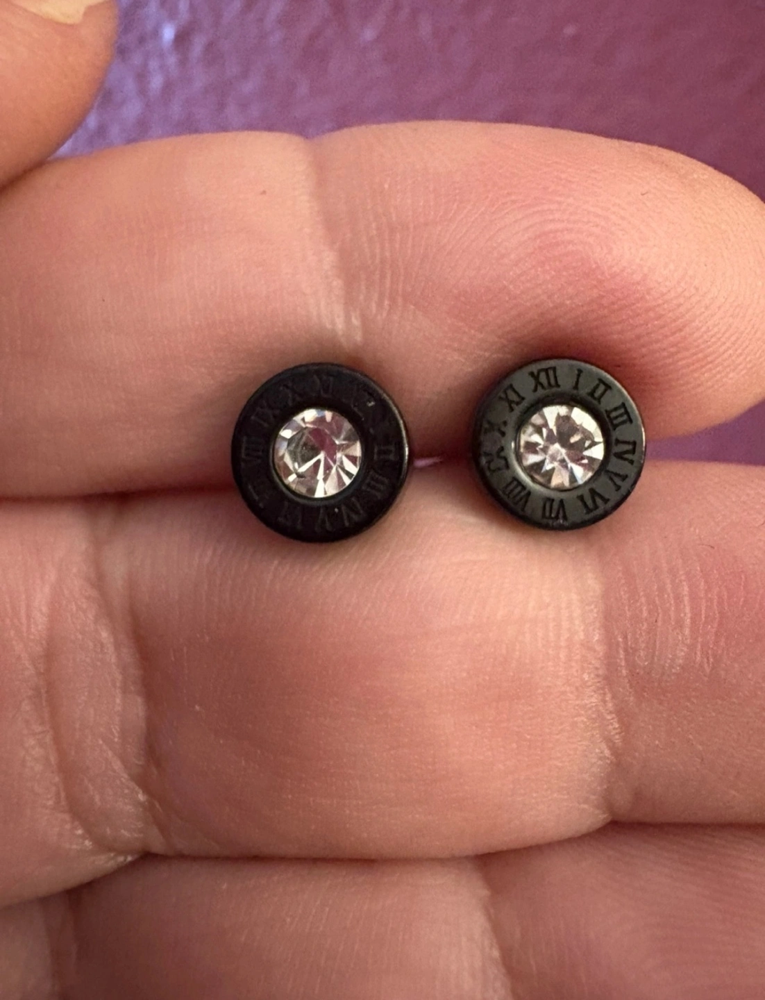 Pair of black titanium steel stud earrings. Roman numerals around clear CZ center. Post back. Comes with Box
