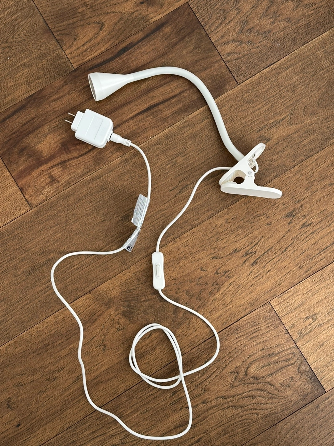 Flexible gooseneck design. White plastic construction. Includes power adapter and inline switch. Clip secures to desk or table.