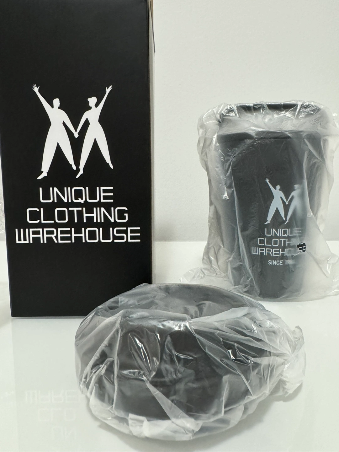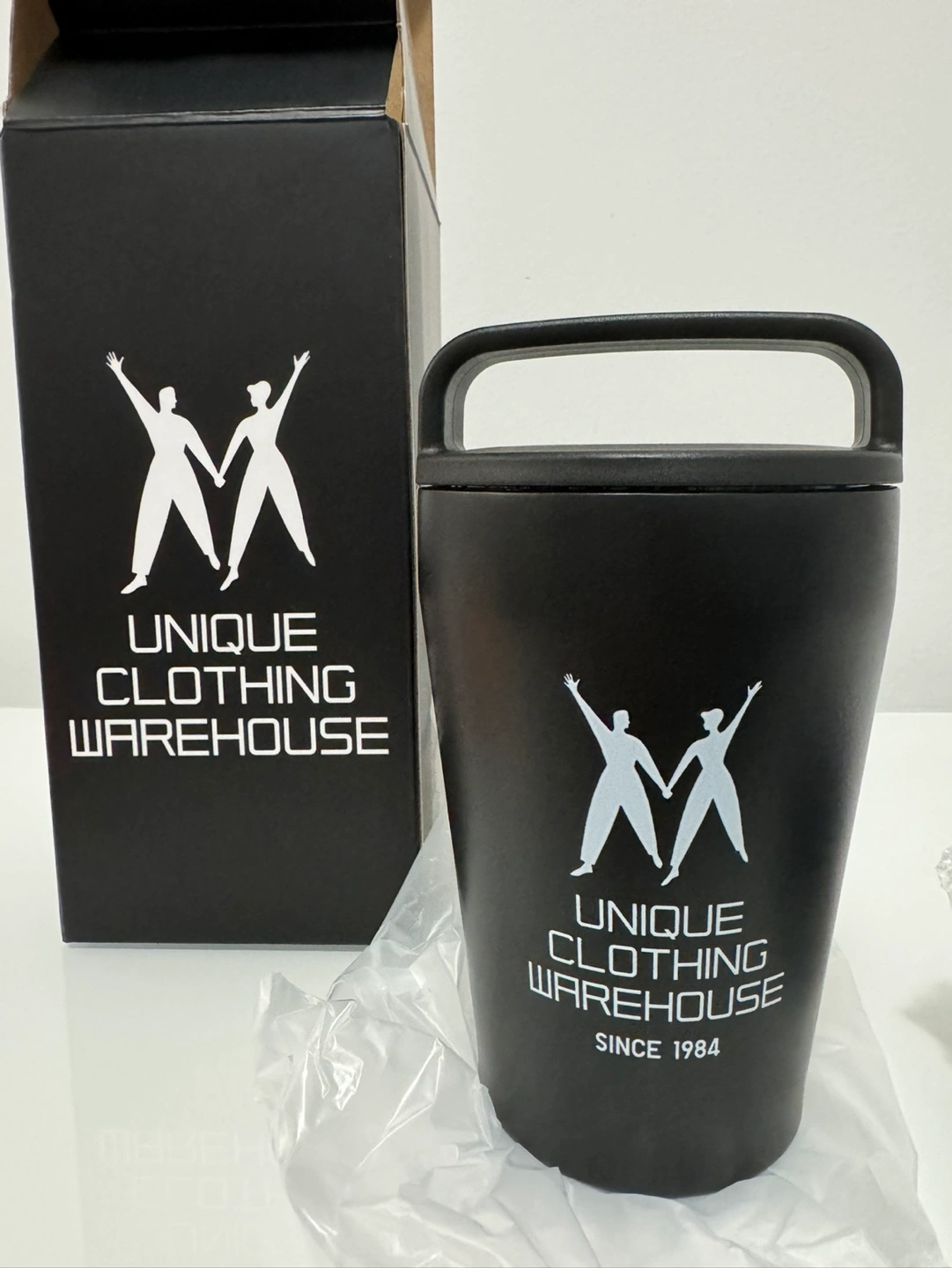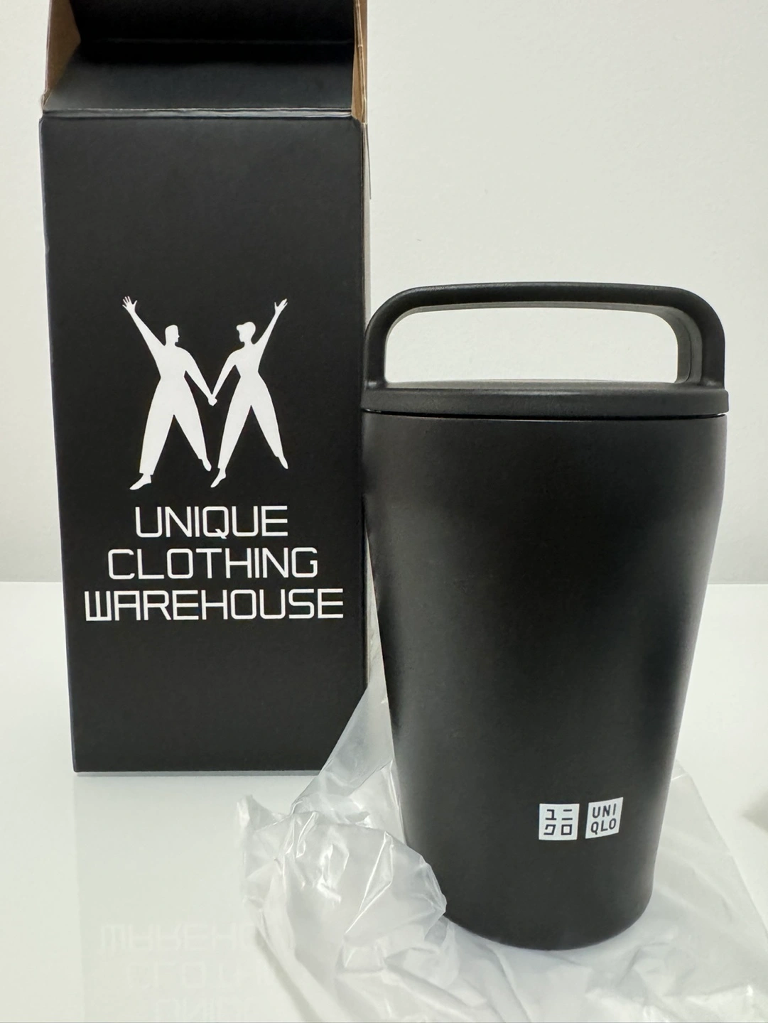 New, black tumbler with carrying handle and lid. Comes in original box. UNIQLO logo on tumbler and box. Perfect for coffee or tea.