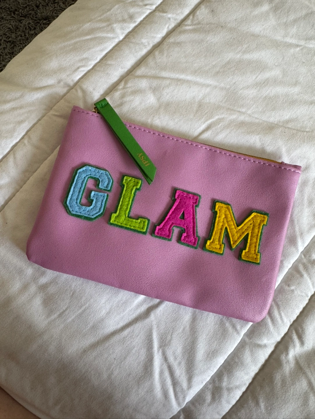 Purple pouch. Features colorful felt letters spelling GLAM. Zipper closure. Small size, perfect for travel.