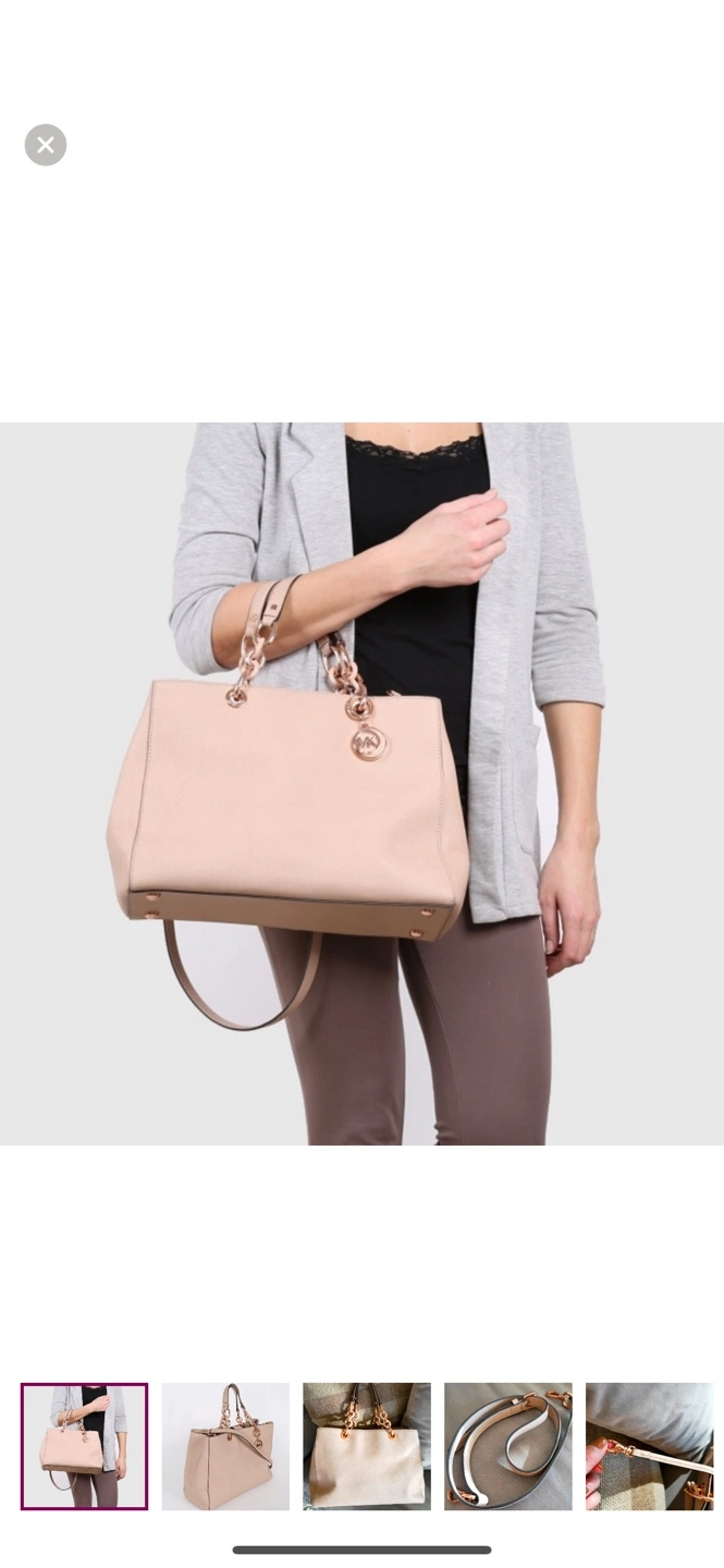 Beautiful pale pink leather tote bag. Features rose gold hardware. Double top handles and a detachable shoulder strap. Multiple interior pockets. Zipper closure.