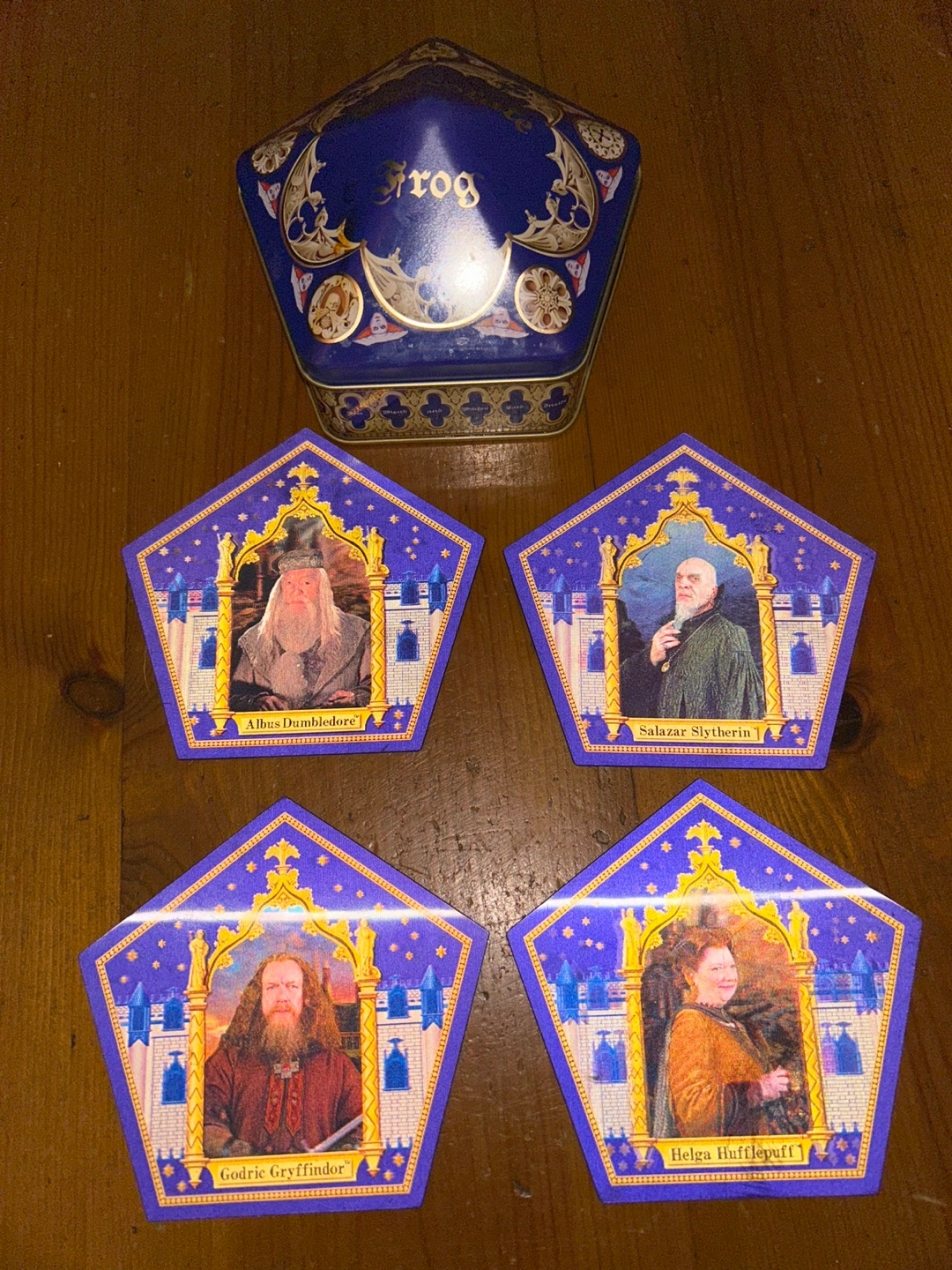 Set of four collectible Chocolate Frog Harry Potter wizard cards. Features Albus Dumbledore, Salazar Slytherin, Godric Gryffindor, and Helga Hufflepuff. Includes original tin box (no chocolate).