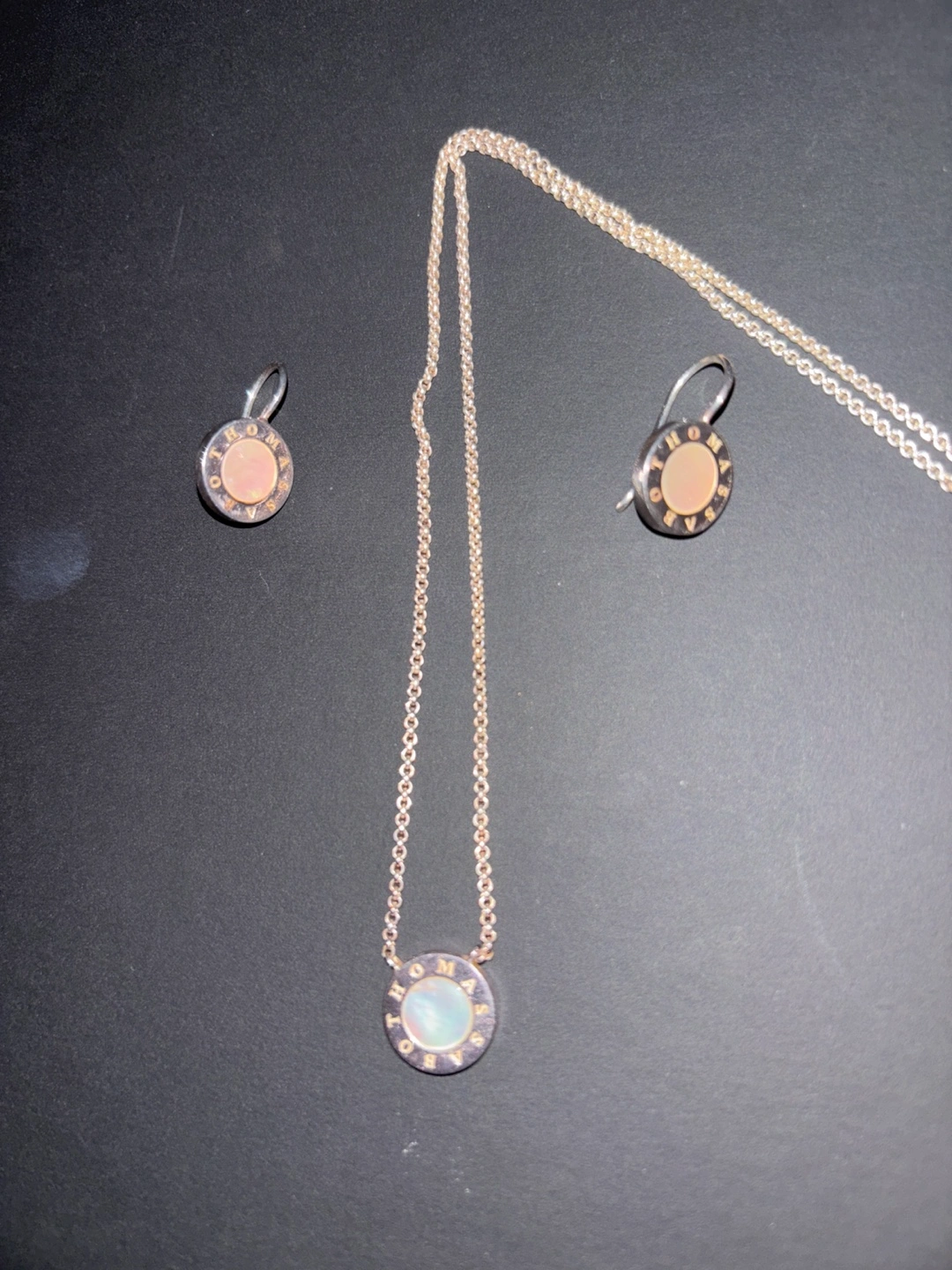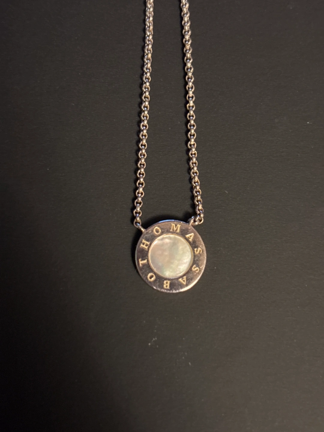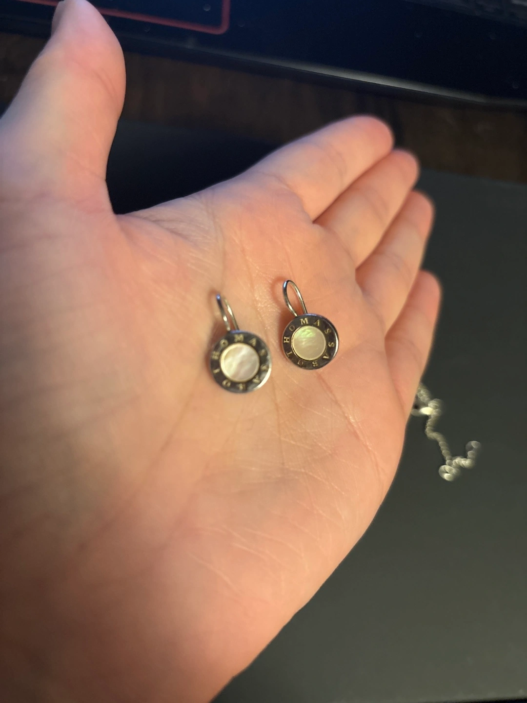 Beautiful Thomas Sabo jewellery set. Includes a necklace and a pair of earrings. Silver-toned metal with mother-of-pearl accents. Elegant and timeless design. Perfect for everyday wear or special occasions.