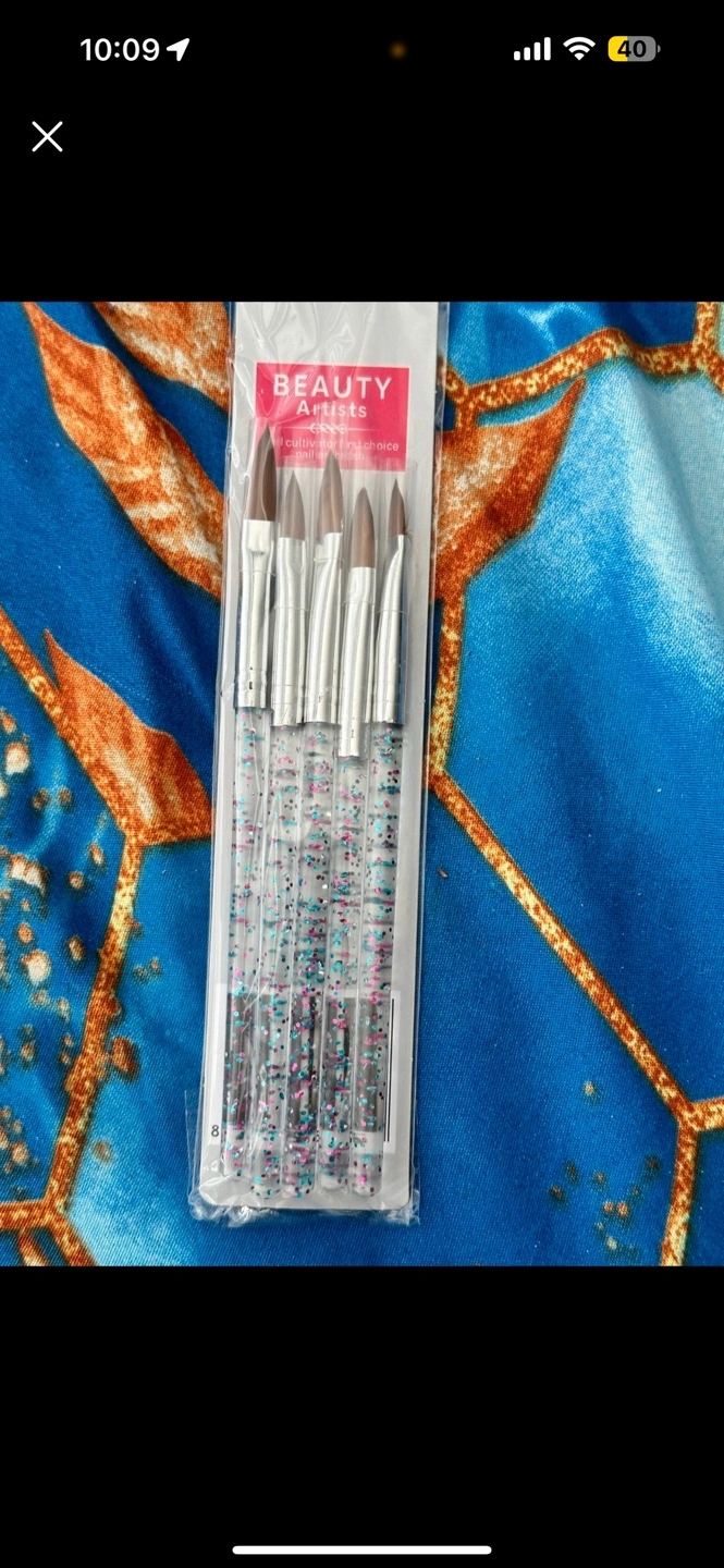 Set of five nail art brushes. Silver metal ferrules and glitter-filled handles. New in package.