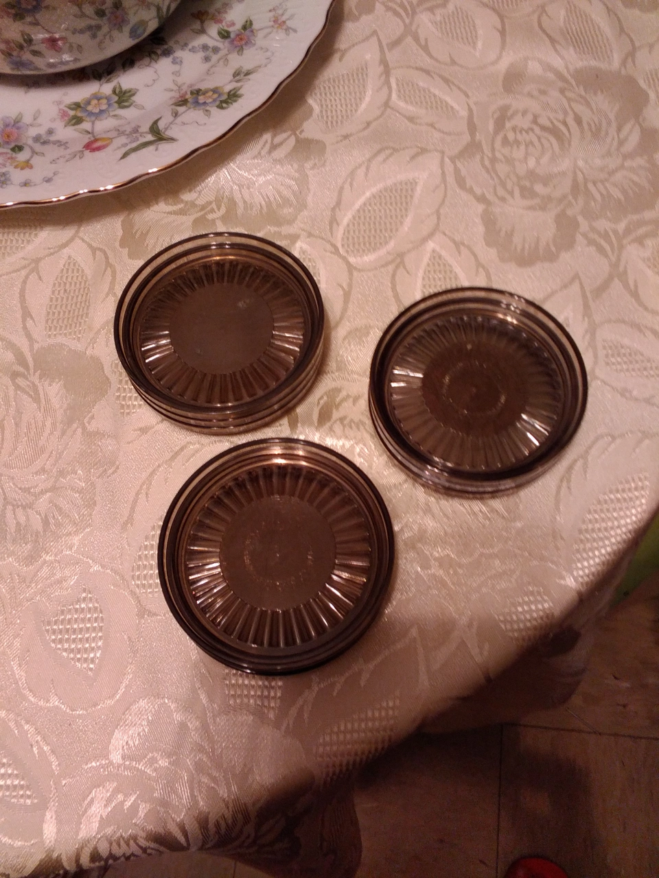 Set of 6 black tint glass Tupperware coasters. Slightly raised design. Perfect for protecting furniture.