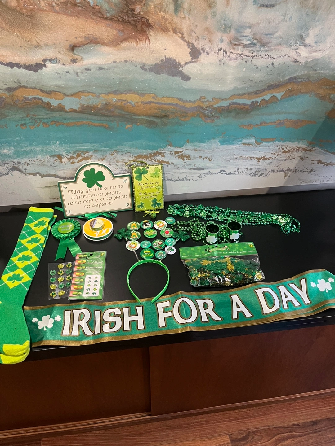 Large St. Patrick's Day party favour bundle. Includes a sash, socks, headbands, beads, buttons, and more. Perfect for a festive celebration. Pick up in Utopia