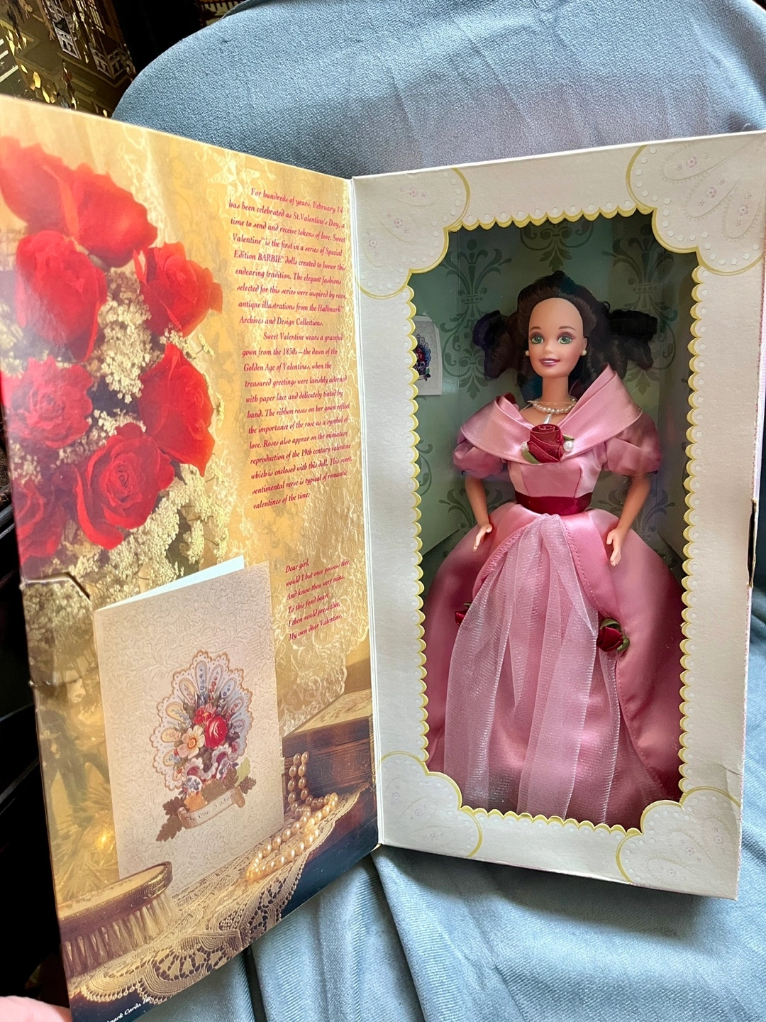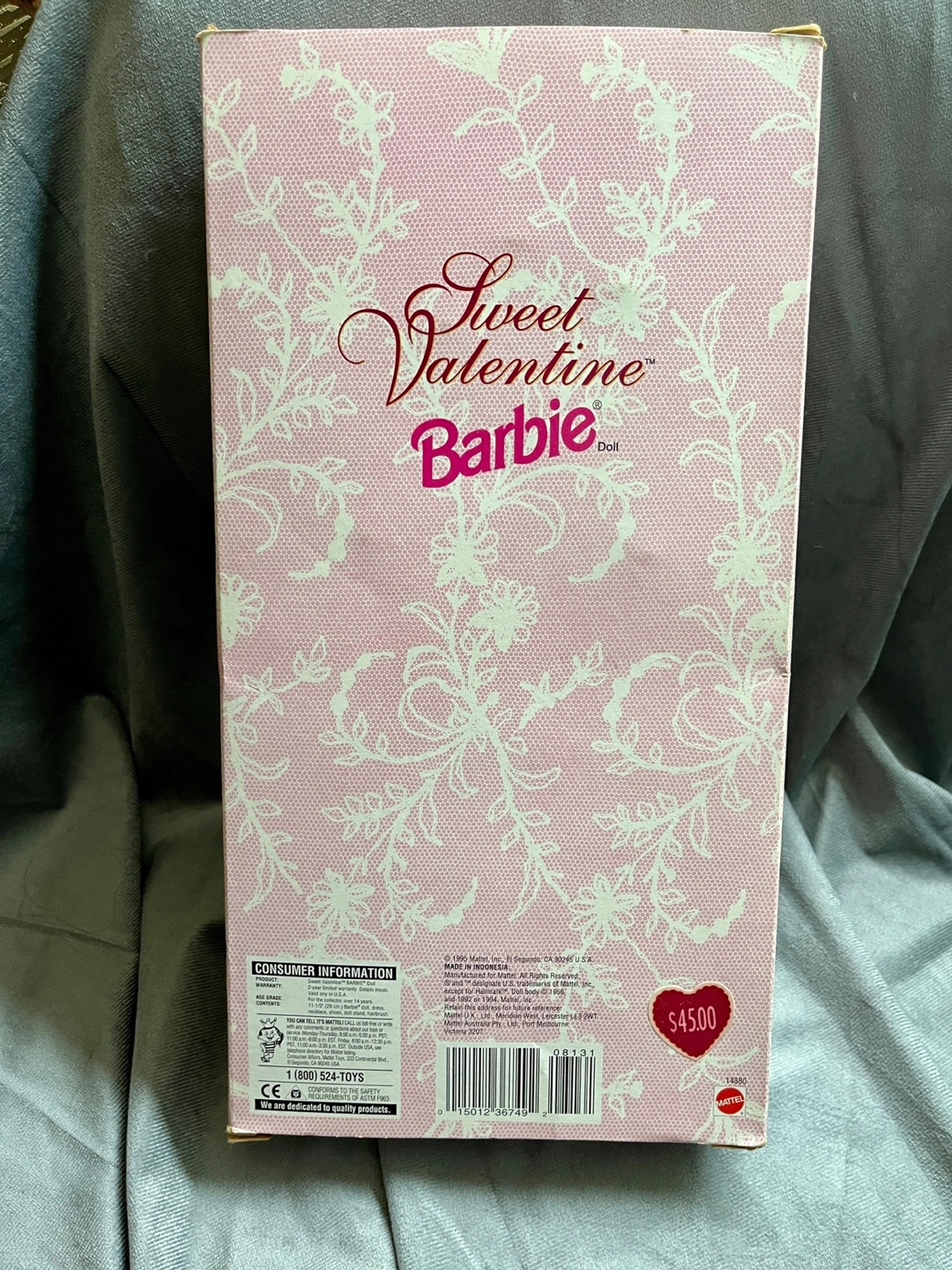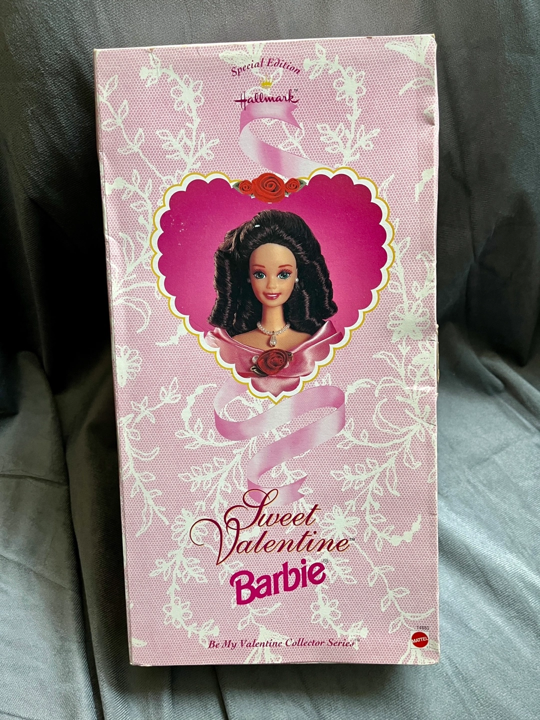 This is a Hallmark Special Edition “Sweet Valentine” Barbie from 1995. She has never been removed from the box. She comes with a paper accessory and display stand.