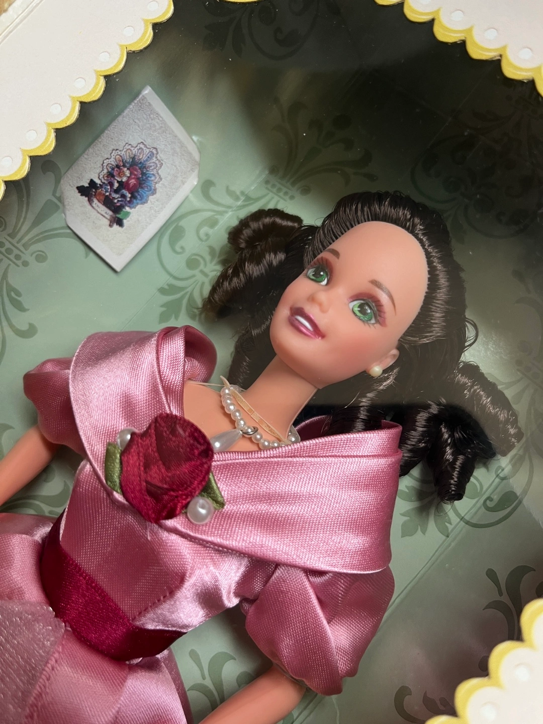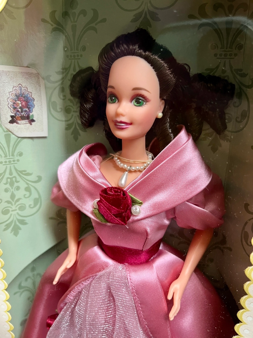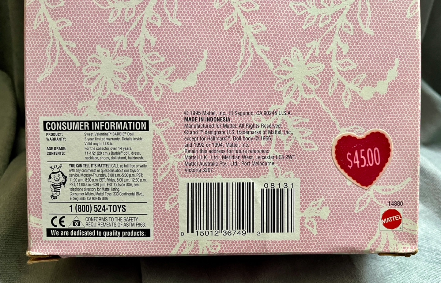 This is a Hallmark Special Edition “Sweet Valentine” Barbie from 1995. She has never been removed from the box. She comes with a paper accessory and display stand.