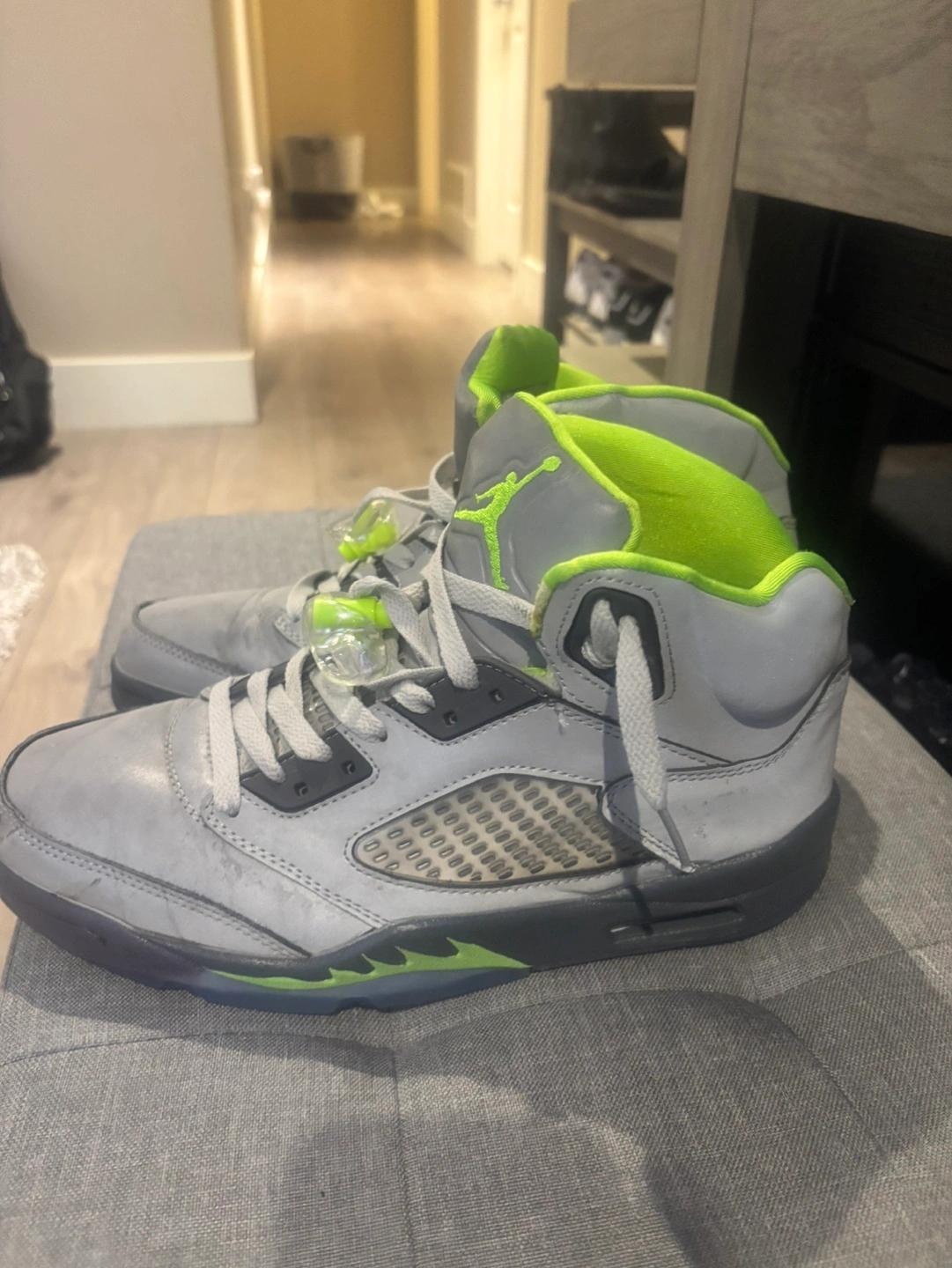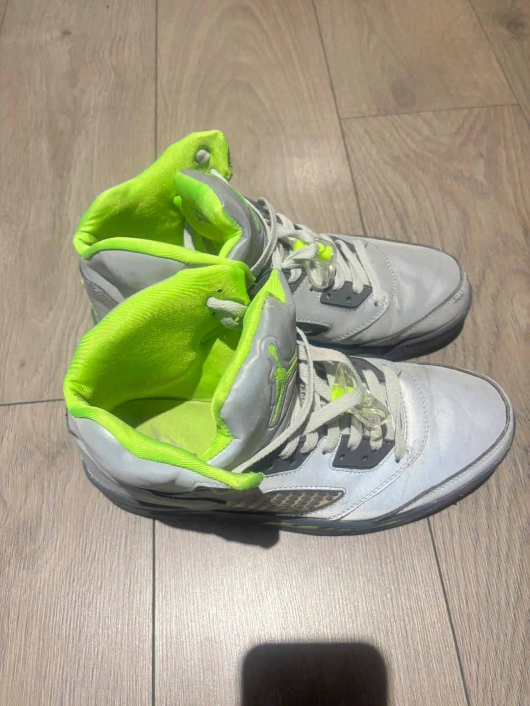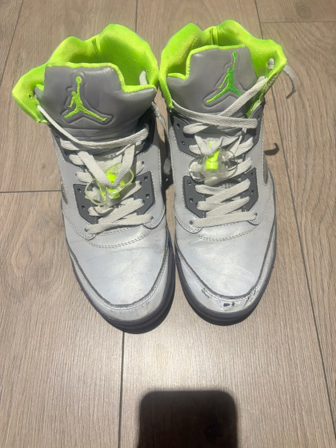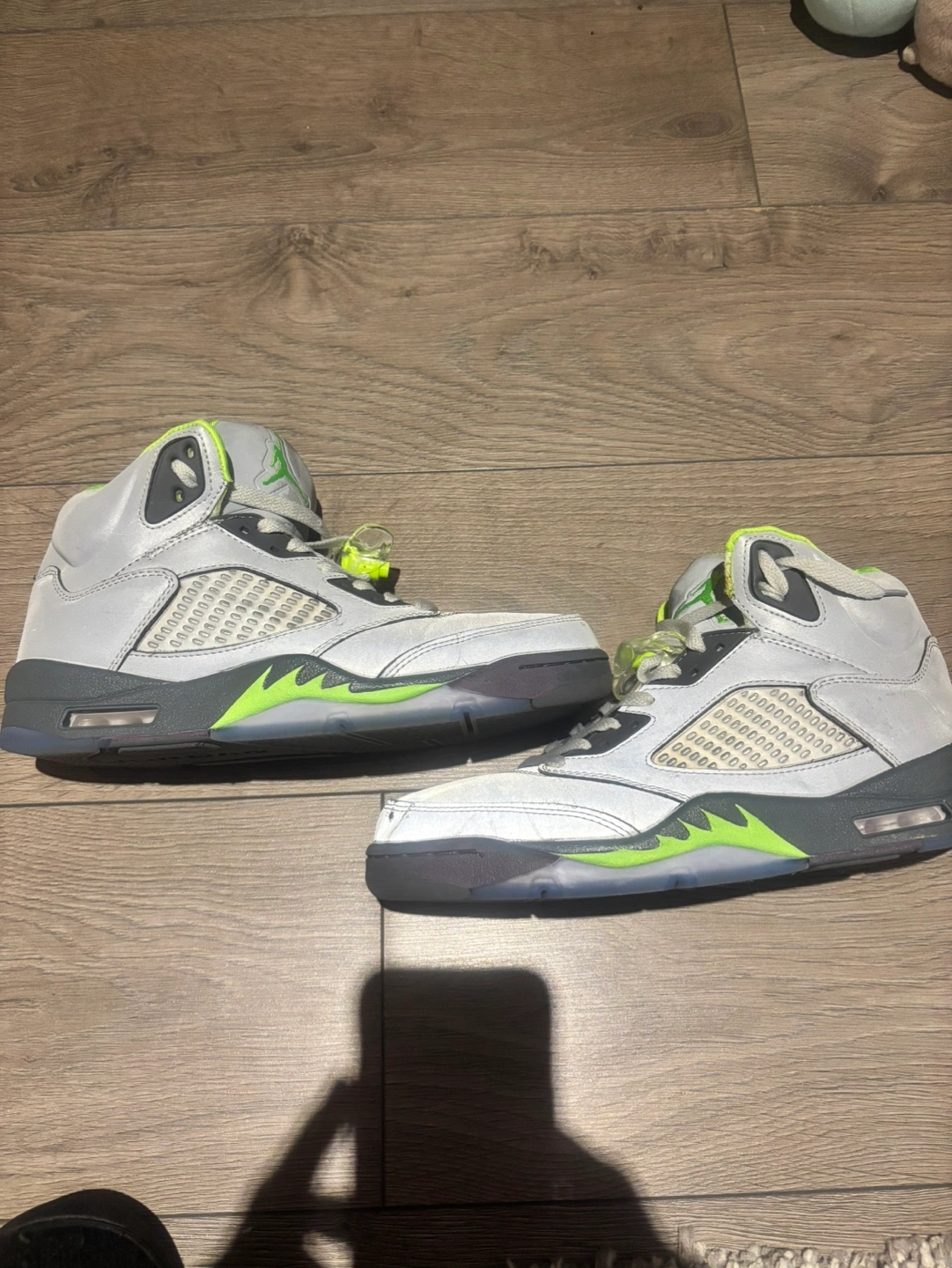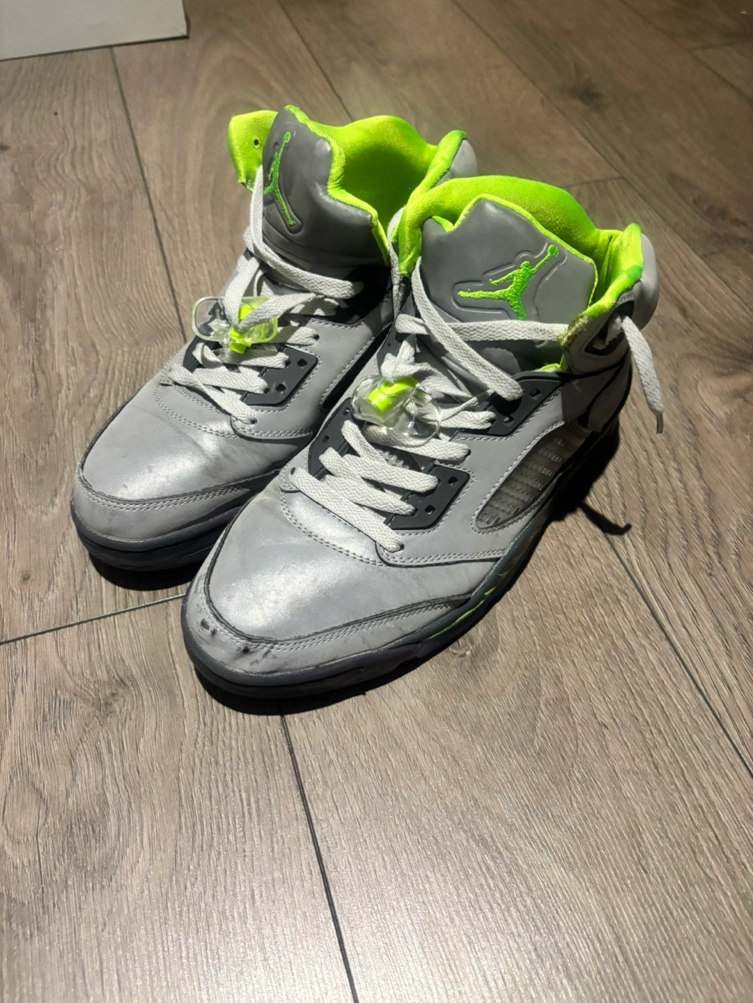 Pre-owned Air Jordan 5 Retro 'Green Bean' sneakers. Size not specified. Show some wear. Great for collectors or casual wear.