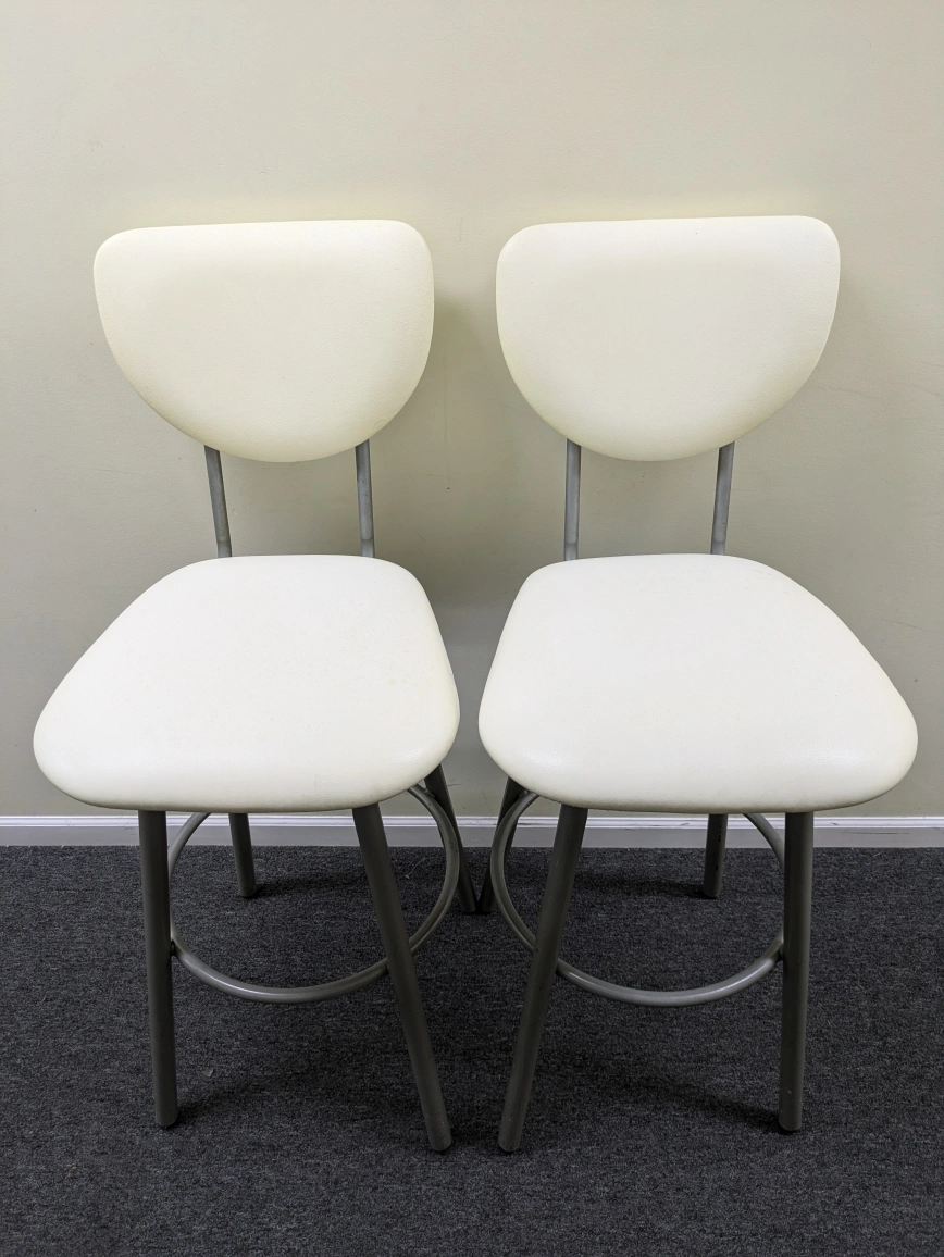 Two off-white bar stools. Metal frame. Cream-colored cushioned seats. Some minor discoloration on seats. Swivel feature.