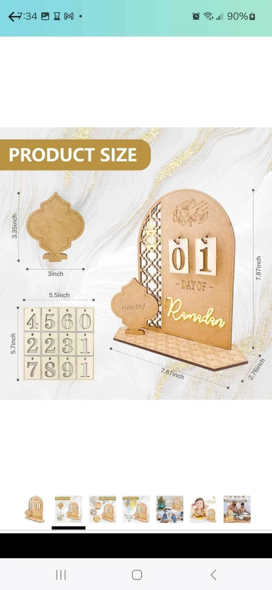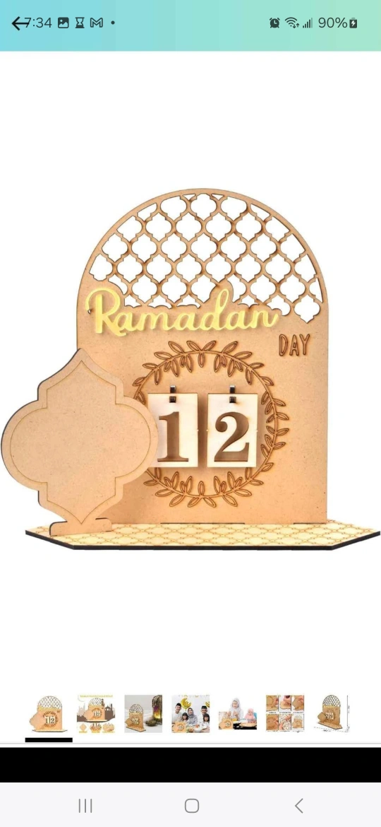 Wooden Ramadan calendar. Features a flip calendar for daily countdown. Includes number tiles for easy date updates. Intricate design, perfect for Ramadan celebrations. $8 each.