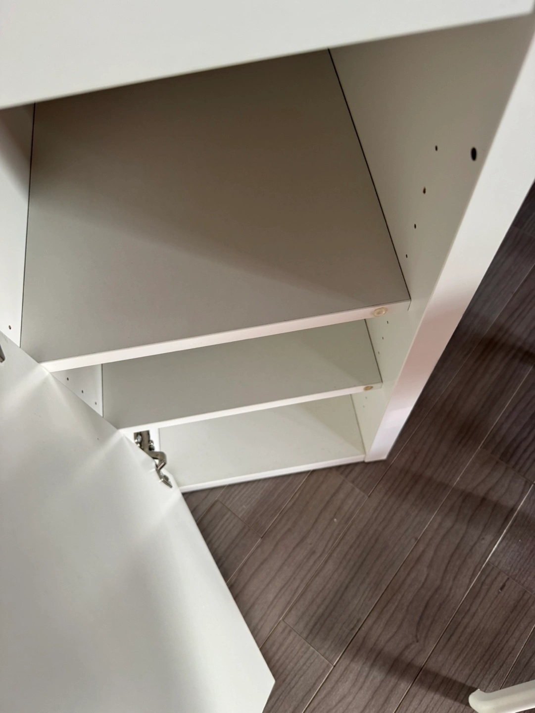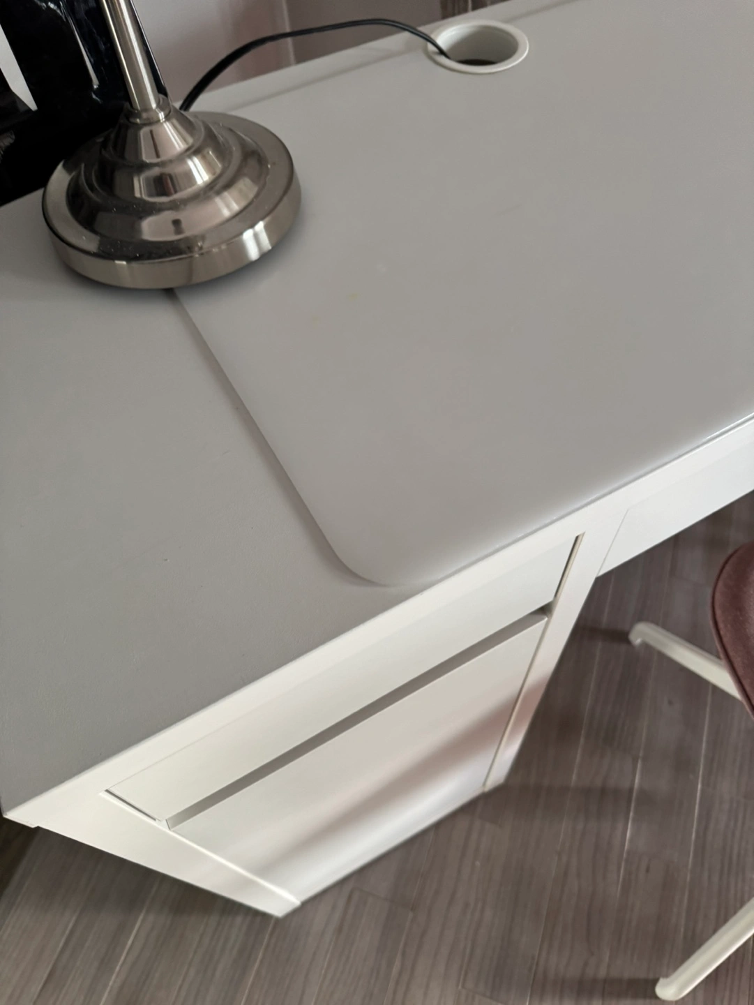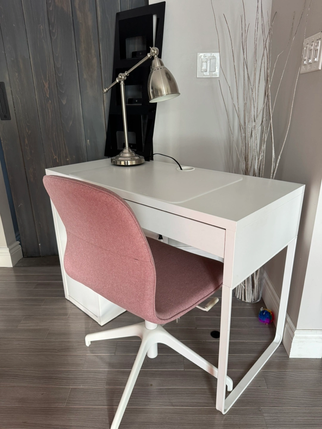 •IKEA white “Mickie” desk with two drawers and storage with 2 shelves. Built-in cable management under the desktop.