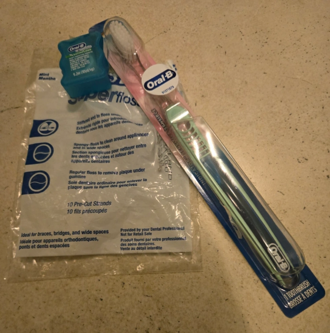 New Oral-B Compete Satinfloss and toothbrush, with bonus Superfloss (open package) designed for cleaning around dental appliances. Perfect for those with braces or wide spaces between teeth. Toothbrush features soft bristles.