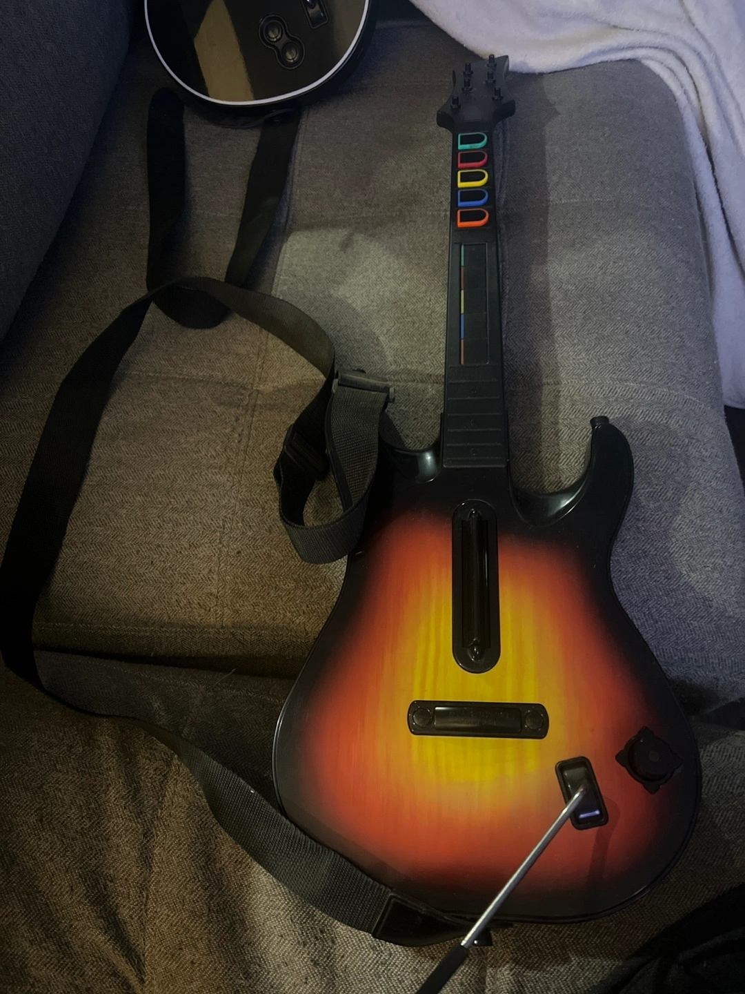 Used Guitar Hero 5 wireless guitar controller. Includes strap. Compatible with Playstation 3. Sunburst finish.
